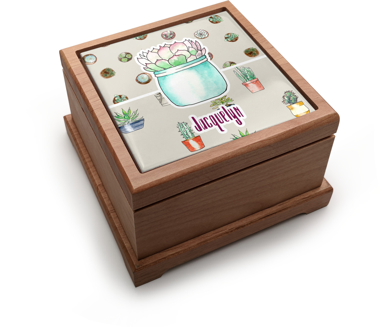 This design has a neutral tan background in order to let the cacti really stand out. You will find two different patterns of potted cacti and potted succulents from a bird's-eye view. The succulents consist of cacti, aloe, and your typical succulent plants. A fun plum and mint colors are used as accent colors throughout the design.