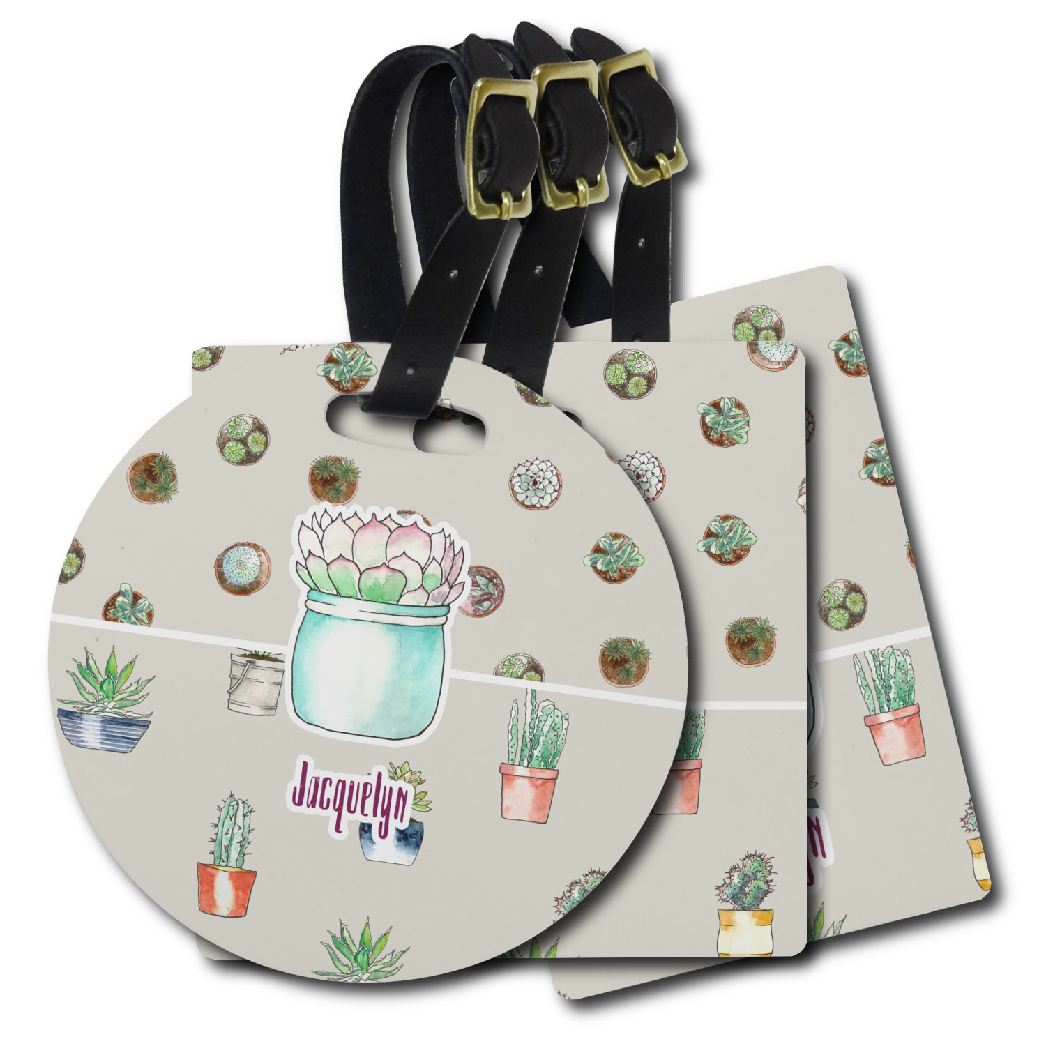 These personalized bag tags are sold in a variety of shapes, so that you may find the product that meets your vision exactly. We sell a round luggage tag, which measures at approximately 4" x 4". Our square luggage tag is about 3.5" x 3.5", while our rectangular version is 2.75" x 4 ".