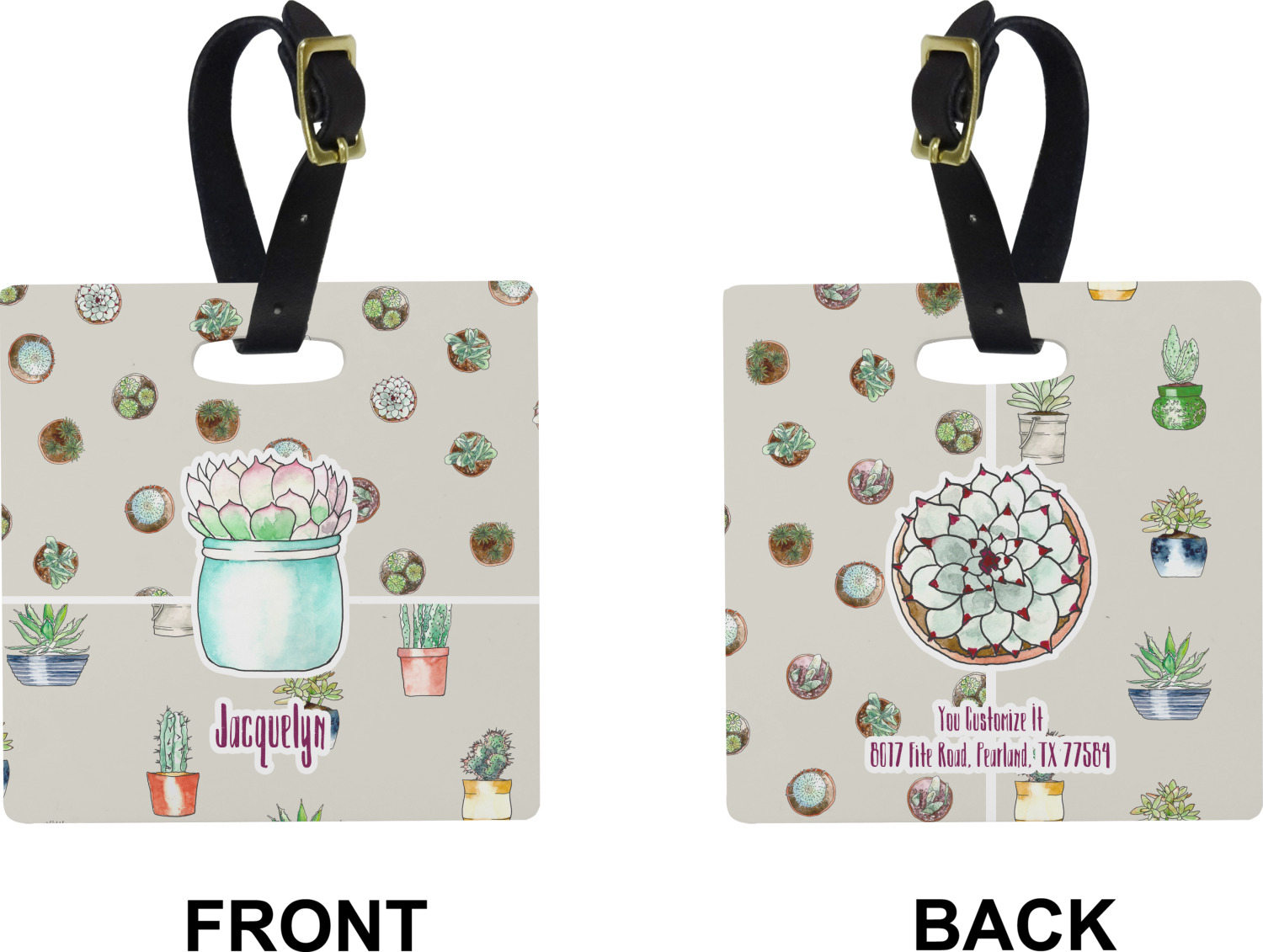 These personalized bag tags are sold in a variety of shapes, so that you may find the product that meets your vision exactly. We sell a round luggage tag, which measures at approximately 4" x 4". Our square luggage tag is about 3.5" x 3.5", while our rectangular version is 2.75" x 4 ".