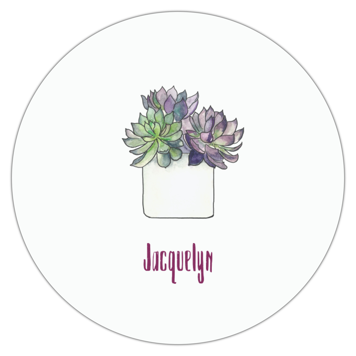 This design has a neutral tan background in order to let the cacti really stand out. You will find two different patterns of potted cacti and potted succulents from a bird's-eye view. The succulents consist of cacti, aloe, and your typical succulent plants. A fun plum and mint colors are used as accent colors throughout the design.
