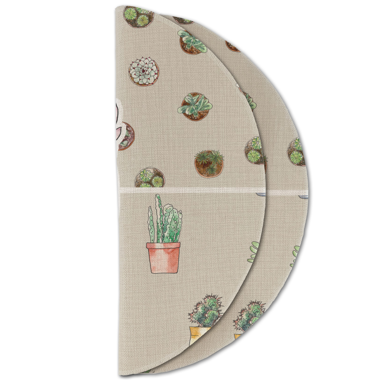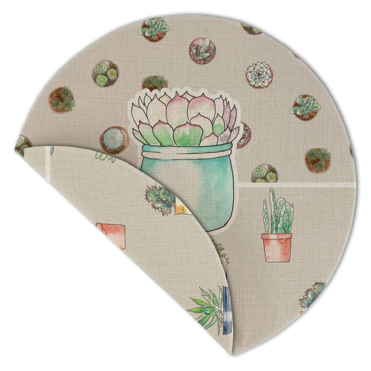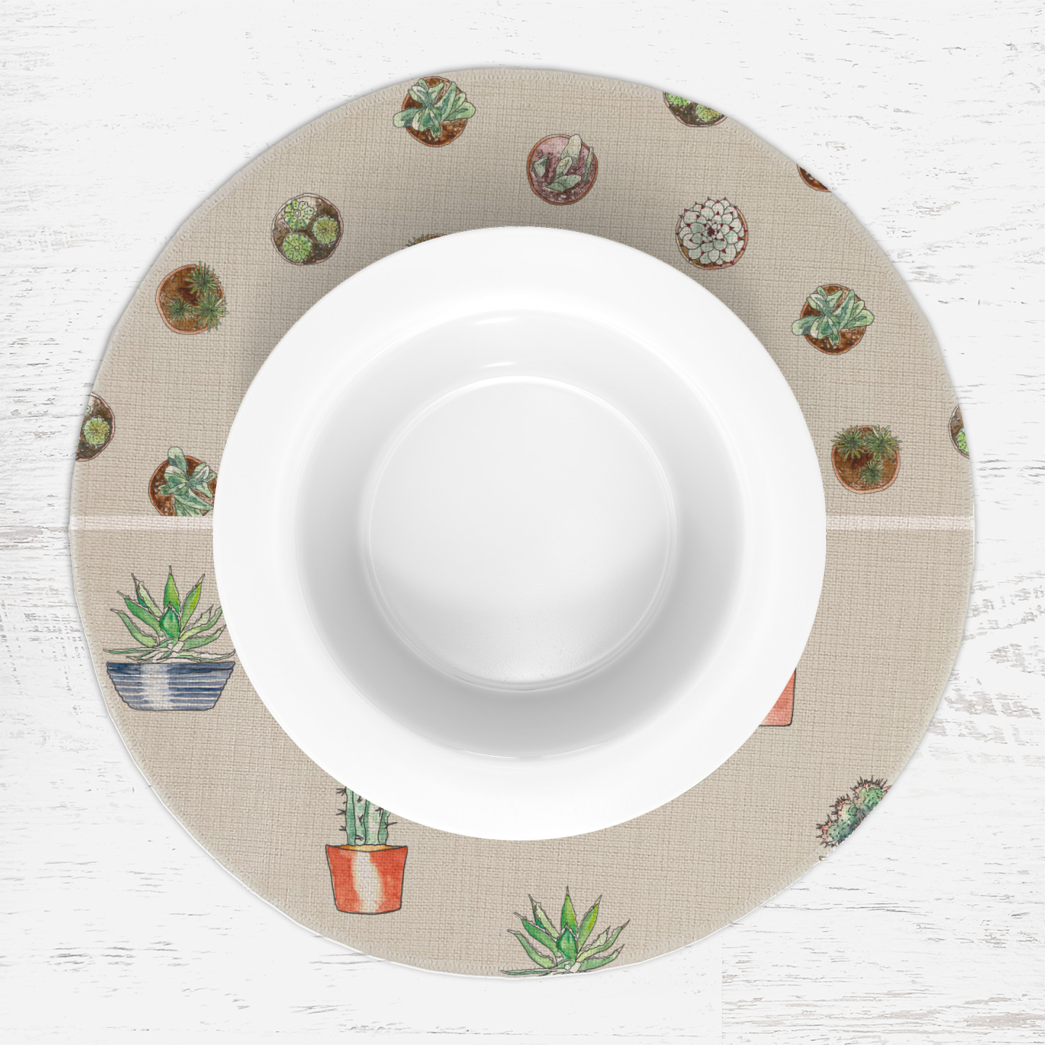 This design has a neutral tan background in order to let the cacti really stand out. You will find two different patterns of potted cacti and potted succulents from a bird's-eye view. The succulents consist of cacti, aloe, and your typical succulent plants. A fun plum and mint colors are used as accent colors throughout the design.