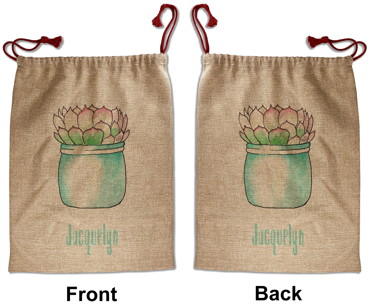 Our Santa sacks print your design on the burlap material giving it a nice rustic, natural design! The burlap material is also machine washable and wrinkle-free, so feel free to fold and store out Santa bags until the next time you need it! Secure your gifts with our red accent drawstring ties at the top of the sack so the mystery of your gift stays a surprise until Christmas day. We offer two types of printing- one side partial print or double-sided partial printing. Design and personalize your own Santa sack in time for the holidays!