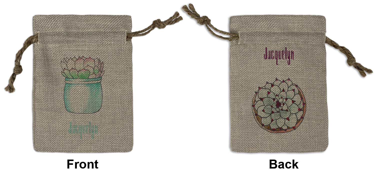 We sell our Burlap Gift Bags in 3 variant sized bags. Made with burlap polyester, each personalized bag can be secured with a twine drawstring pull. Your custom design is available to print on one side or both sides - completely up to you! The sizes of the bags measure approximately 4.5" x 6.5" for the smallest size, 6.5" x 8.0" for the medium size, and 6.5" x 13.5" for the large-sized bag.