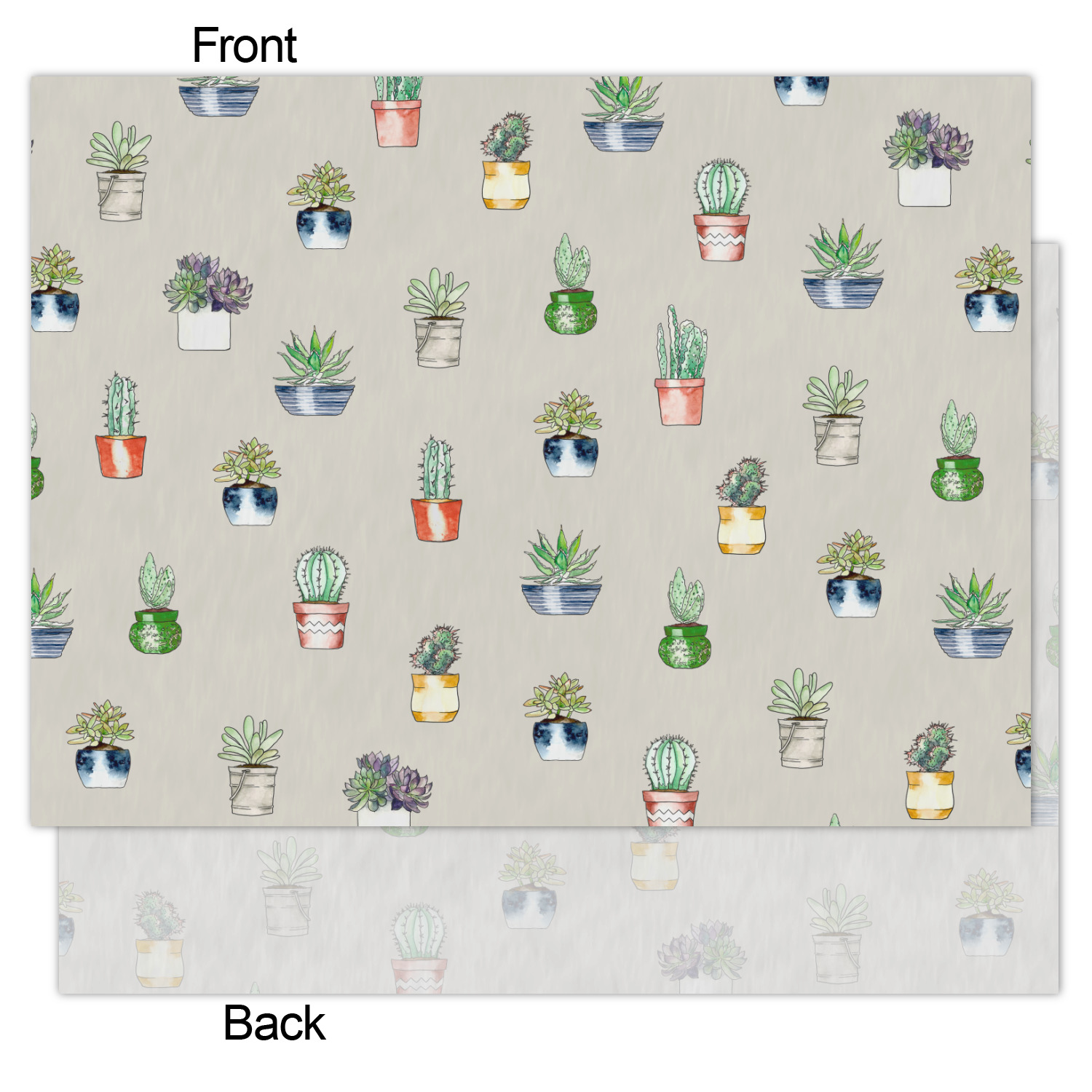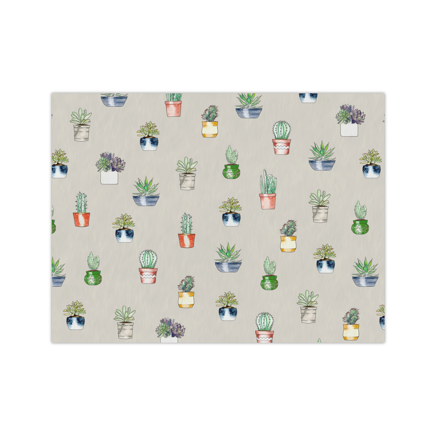 This design has a neutral tan background in order to let the cacti really stand out. You will find two different patterns of potted cacti and potted succulents from a bird's-eye view. The succulents consist of cacti, aloe, and your typical succulent plants. A fun plum and mint colors are used as accent colors throughout the design.