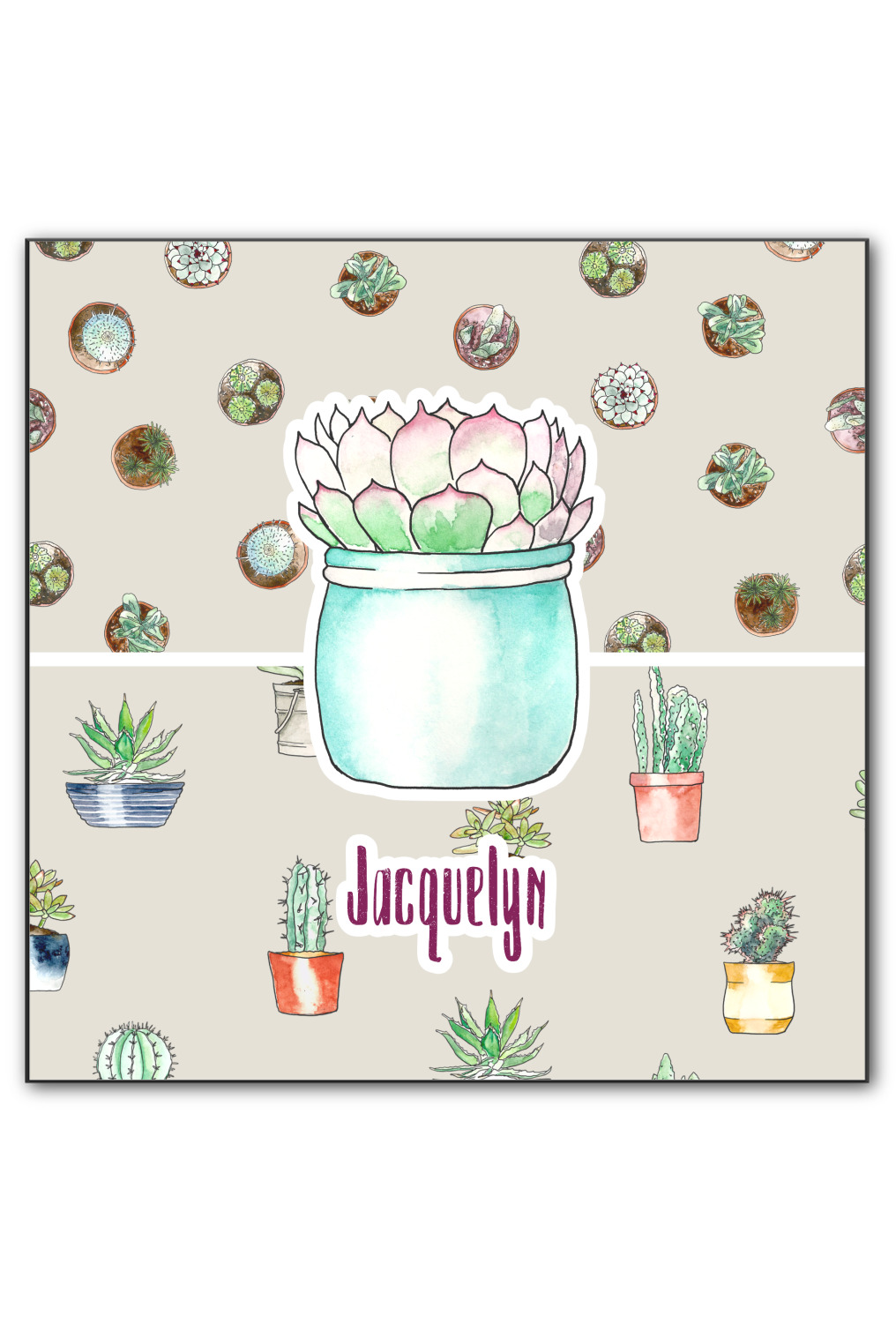 This design has a neutral tan background in order to let the cacti really stand out. You will find two different patterns of potted cacti and potted succulents from a bird's-eye view. The succulents consist of cacti, aloe, and your typical succulent plants. A fun plum and mint colors are used as accent colors throughout the design.
