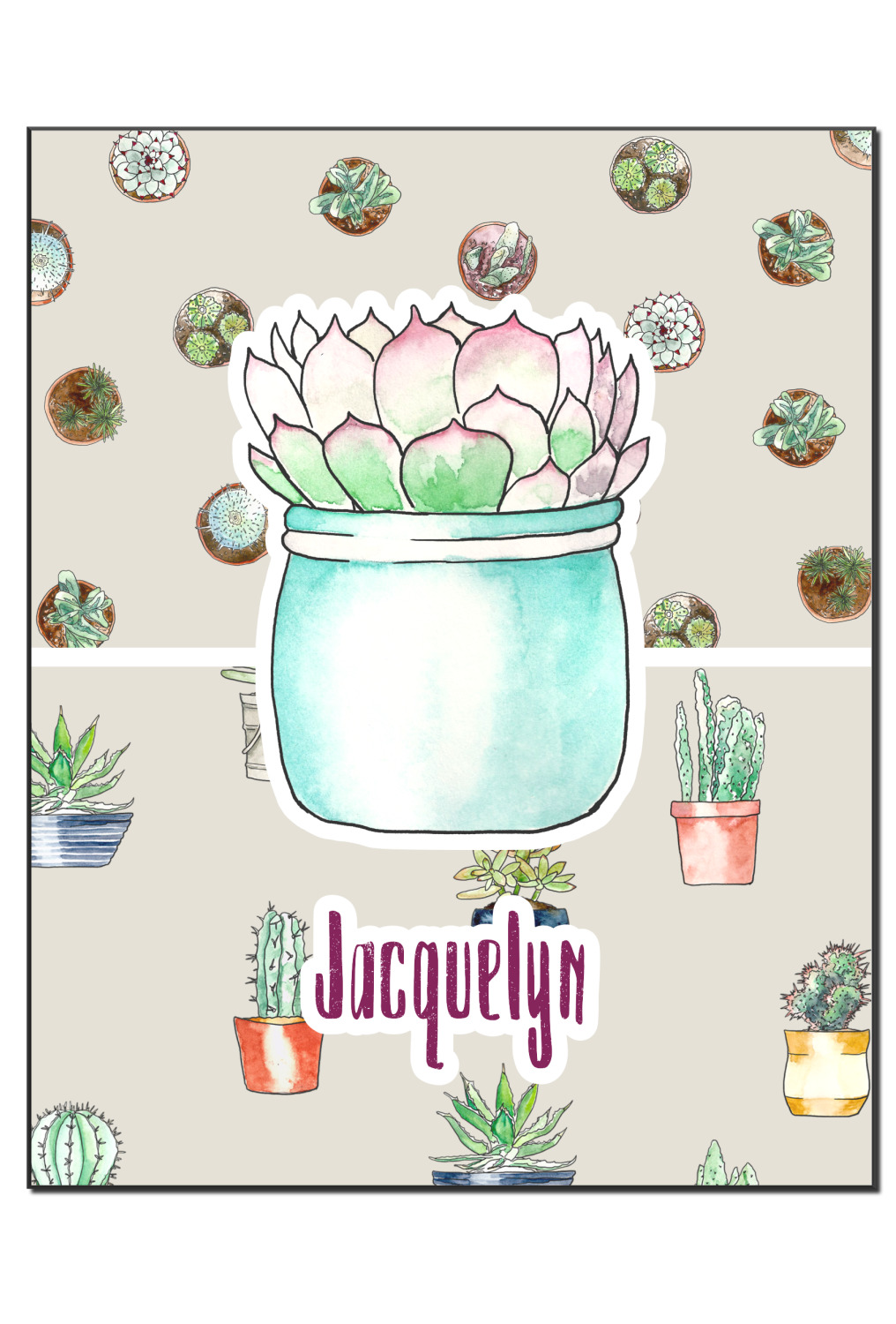 This design has a neutral tan background in order to let the cacti really stand out. You will find two different patterns of potted cacti and potted succulents from a bird's-eye view. The succulents consist of cacti, aloe, and your typical succulent plants. A fun plum and mint colors are used as accent colors throughout the design.