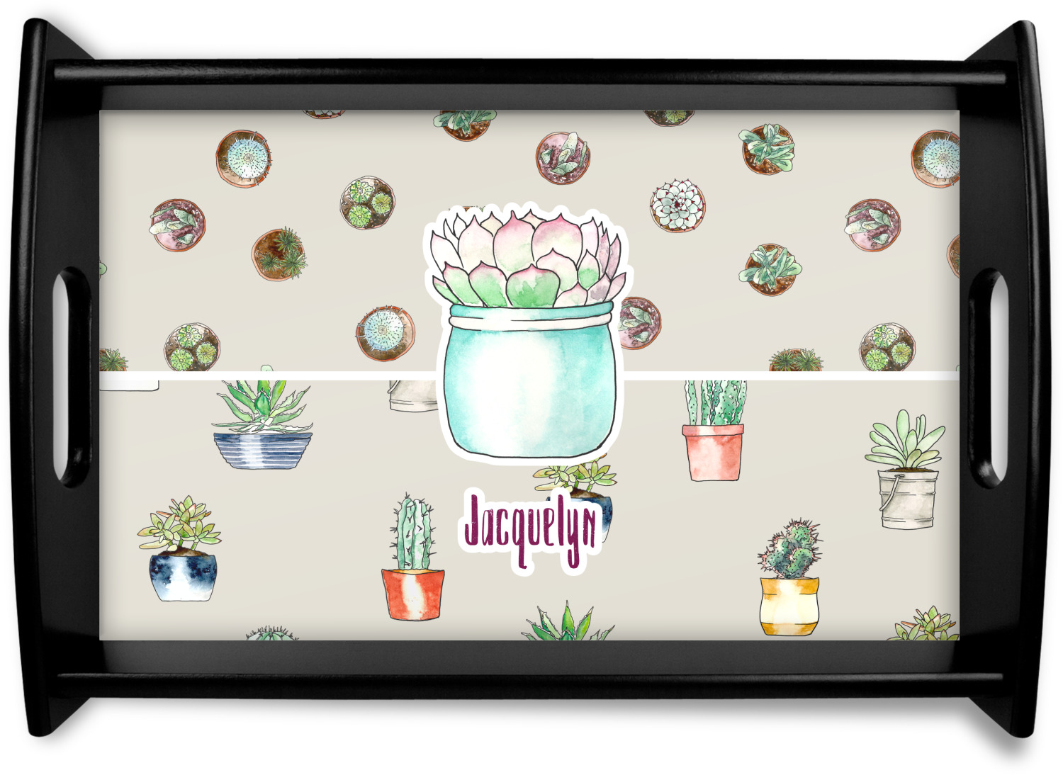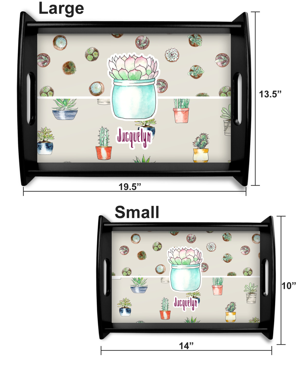 This serving tray with handles features square edges and two rounded sides, creating a very modern look. Each side is fabricated from a beautifully cut, natural wood. The bottom of the interior of the tray displays your customized design in bright, vibrant color. The tray is sold in both a black color and a natural wood look. Each variation of the wood serving tray has two sizes: Small, which is 14" x 10" x 2.25", and Large, which is 19.5" x 13.5" x 2.75".