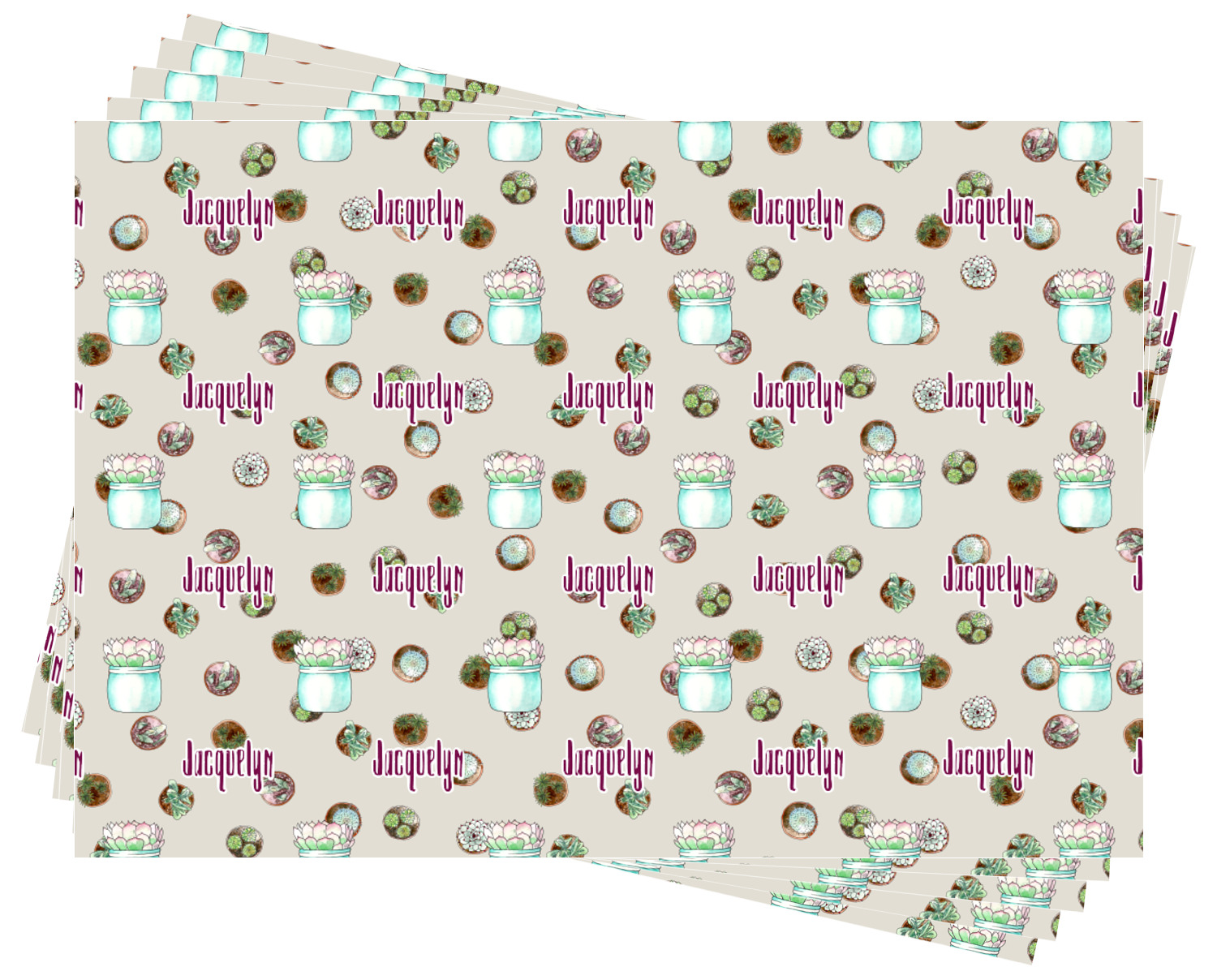 This design has a neutral tan background in order to let the cacti really stand out. You will find two different patterns of potted cacti and potted succulents from a bird's-eye view. The succulents consist of cacti, aloe, and your typical succulent plants. A fun plum and mint colors are used as accent colors throughout the design.