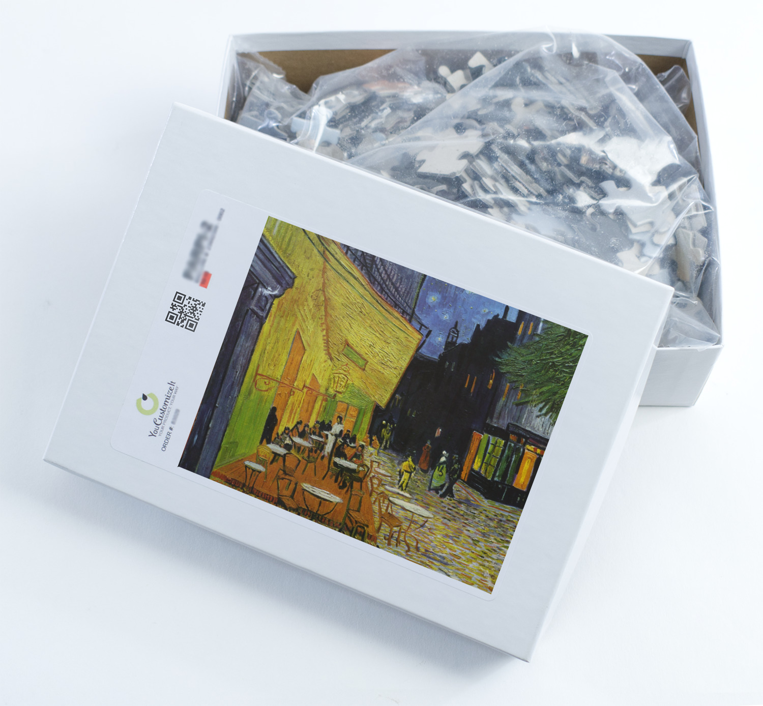We print our puzzles on thick white chipboard in vibrant colors, then laminate the chipboard and die cut your puzzle. Your jigsaw puzzle is shipped to you in a box with the image of the puzzle on the box.