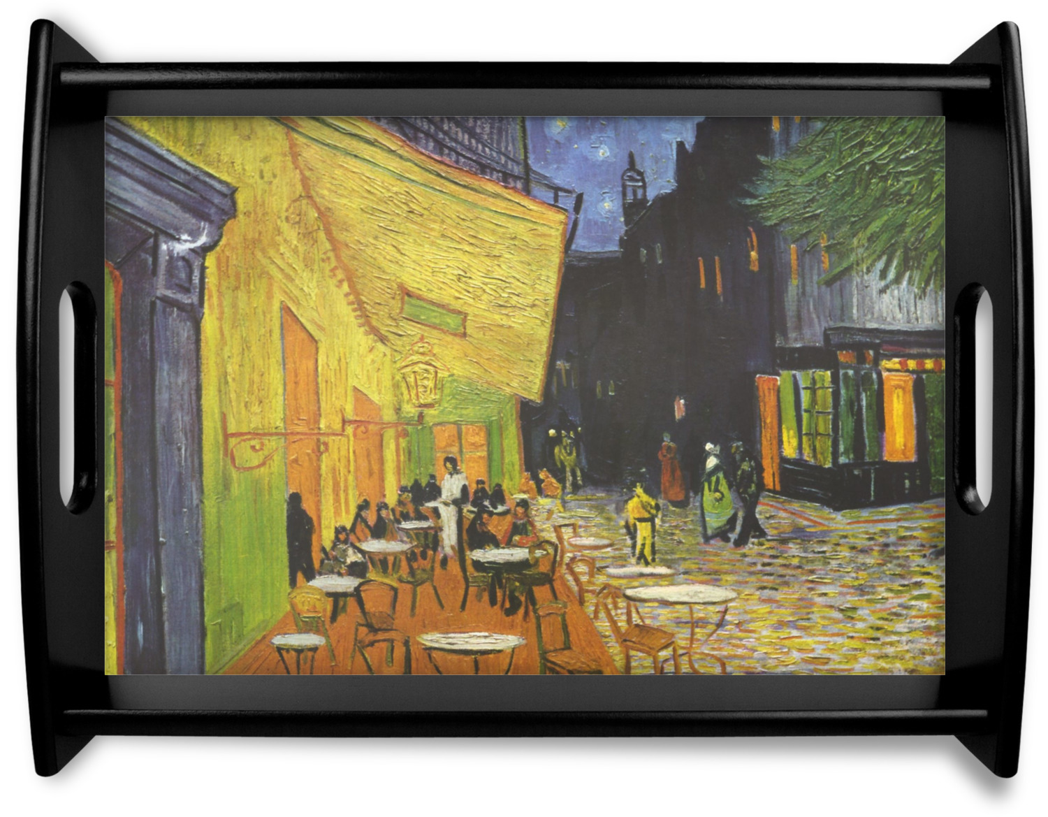 This serving tray with handles features square edges and two rounded sides, creating a very modern look. Each side is fabricated from a beautifully cut, natural wood. The bottom of the interior of the tray displays your customized design in bright, vibrant color. The tray is sold in both a black color and a natural wood look. Each variation of the wood serving tray has two sizes: Small, which is 14" x 10" x 2.25", and Large, which is 19.5" x 13.5" x 2.75".