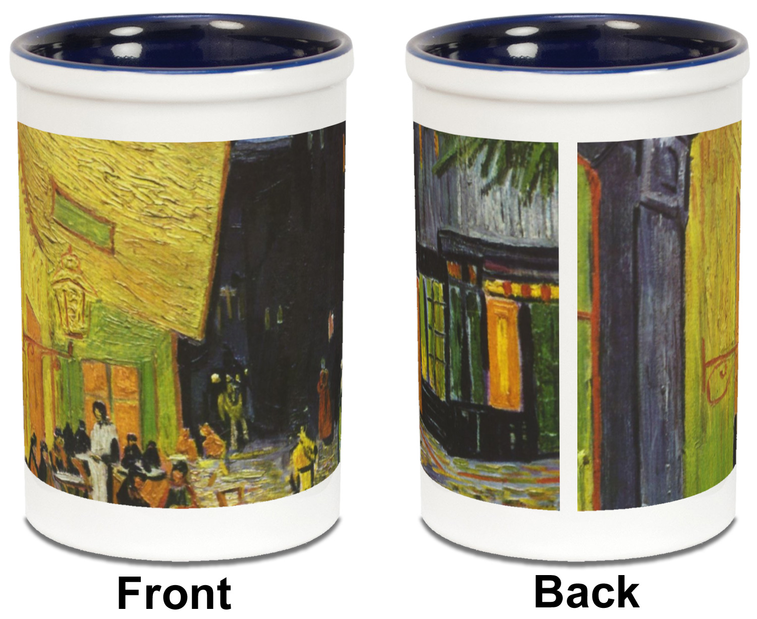 Both the blue and black pencil holders are a ceramic material, giving you a sturdy and long-lasting pen and pencil holder. We print your designs on the exterior of the pencil cup, covering most of the outside surface. There is a small white border on the top and bottom of the exterior of the pen holder, setting apart your design from the interior's color. Our ceramic pen caddy is roughly 3.5" x 3.5" x 5" in dimensions.