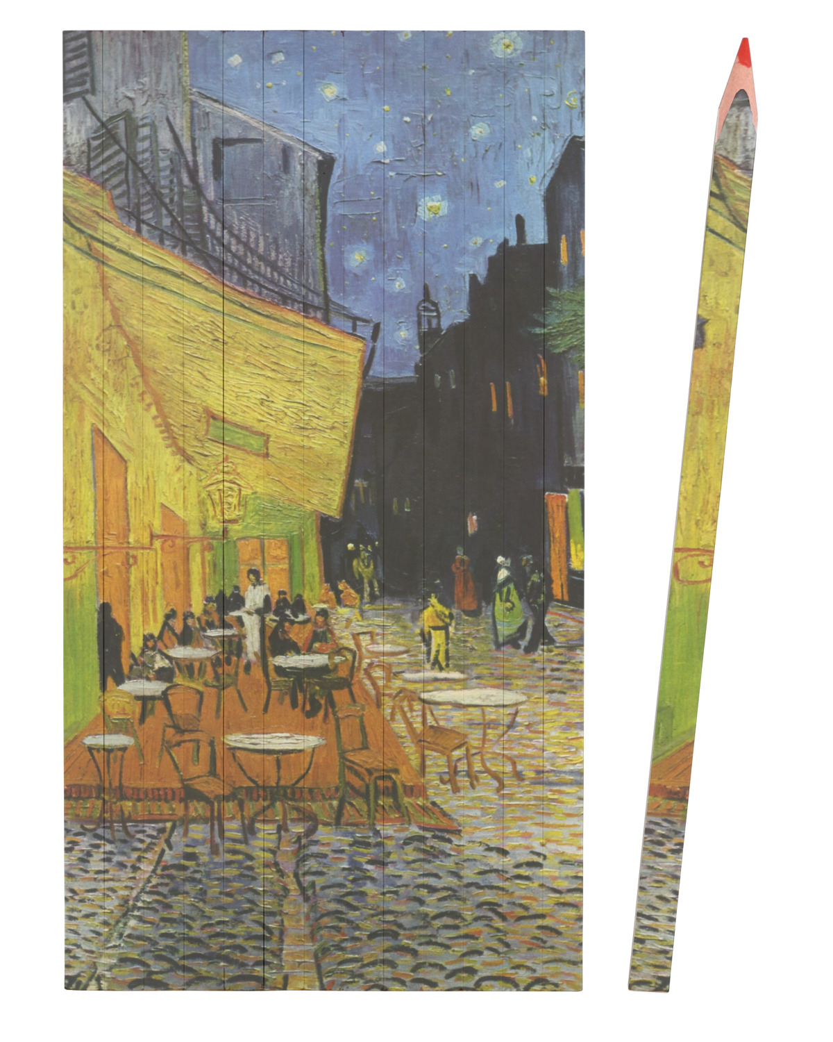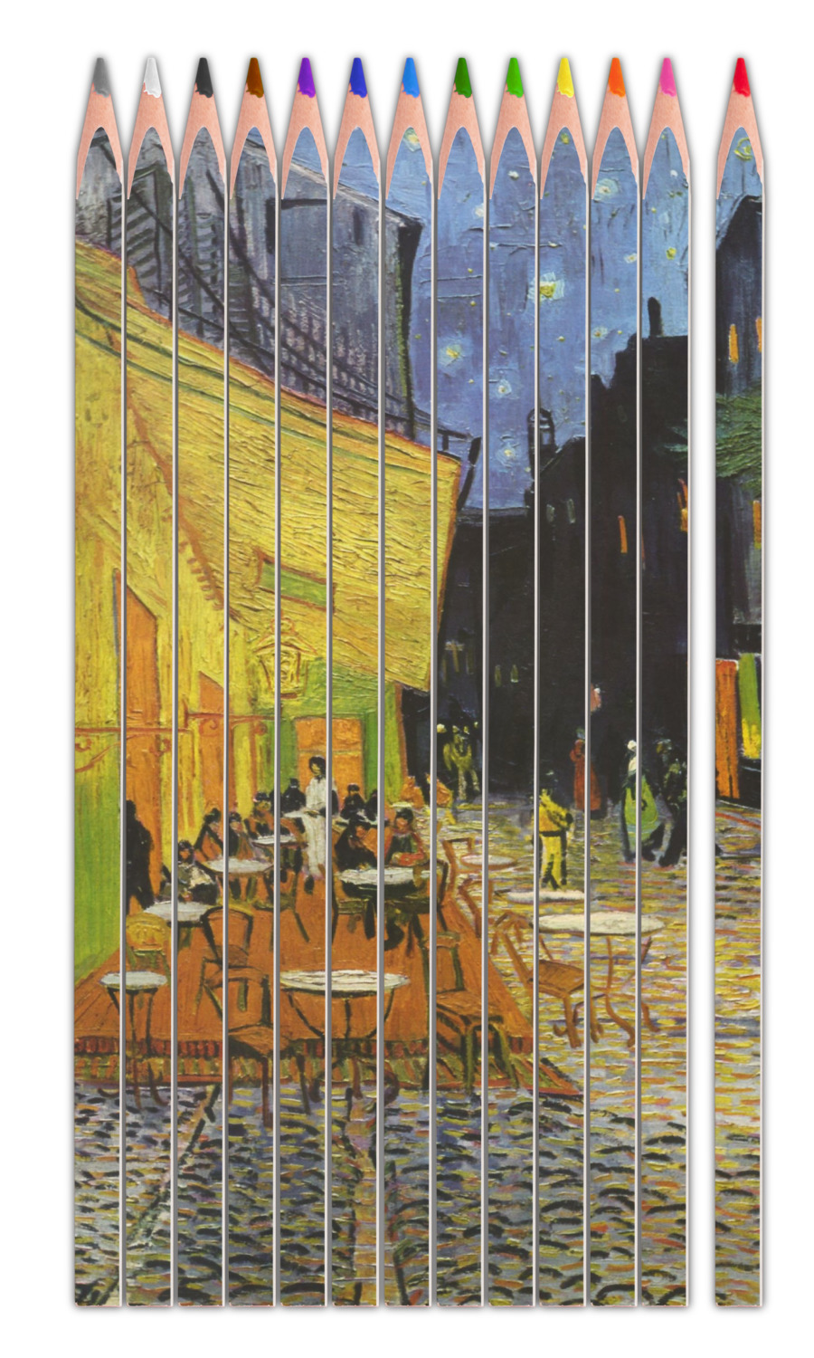 Your artwork / design is printed in full color across the top of all 13 pencils. The back and sides of the pencils are white. The pencils come in a clear plastic container / carrying case.