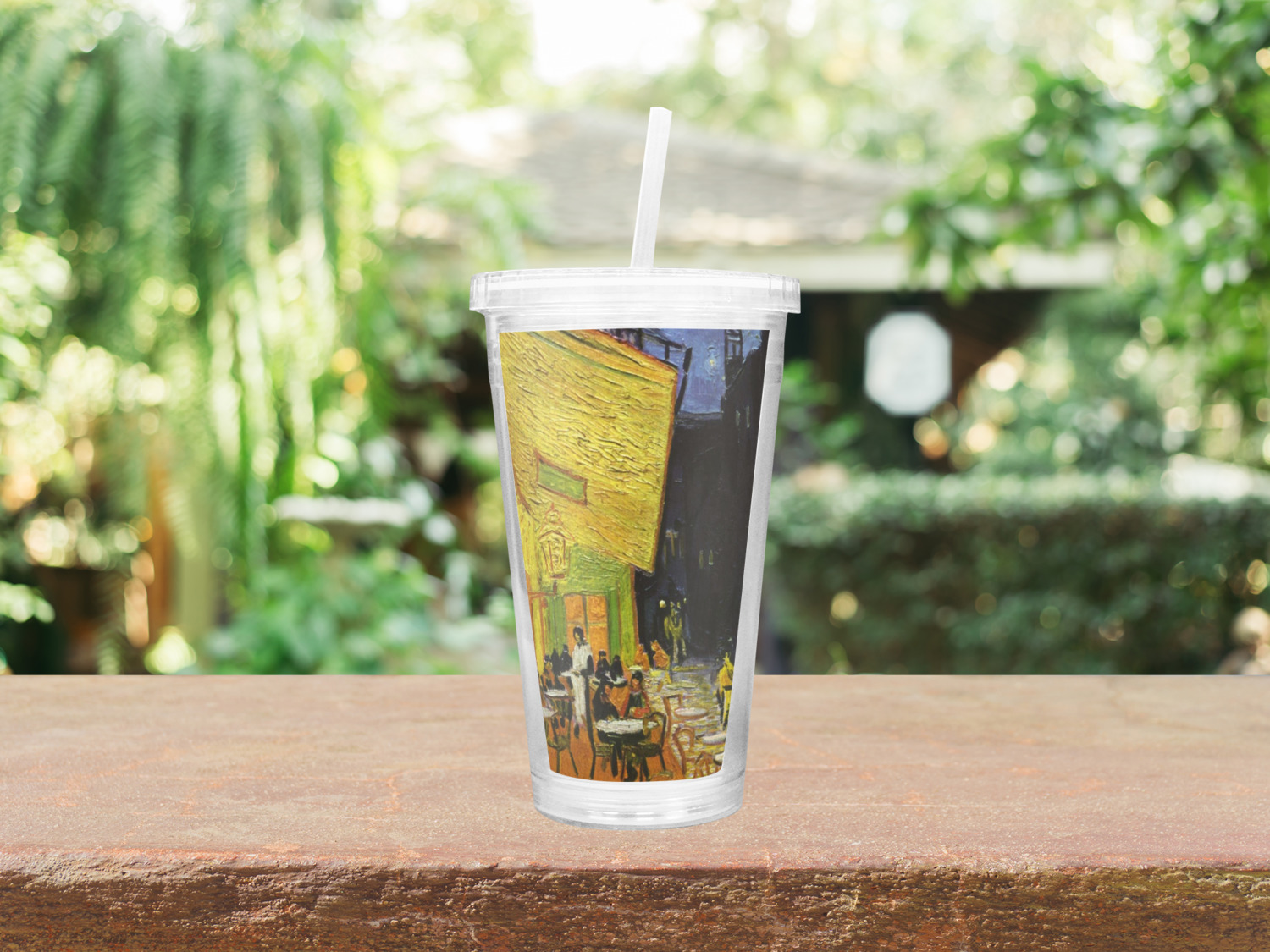 These BPA free tumblers with their double walls keep your drink cold and will not sweat on the outside; they have a clear acrylic top and a reusable straw with a ring around the bottom to keep the straw from falling out.