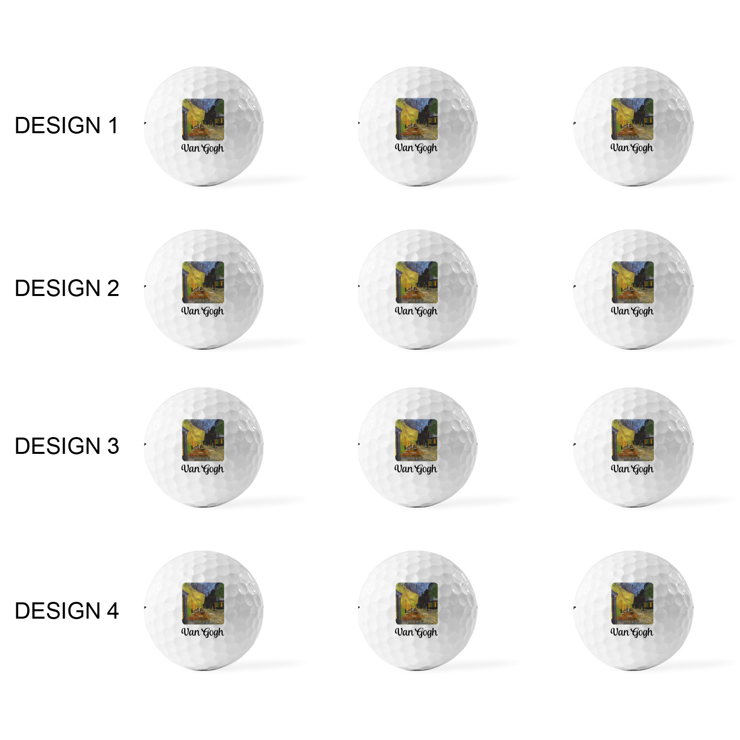 Printed in a 7/8" circle on each ball, you can customize these with our design studio or use your own designs. For a set of 3 you can design each one individually, for a set of 12 you will be able to use 4 unique designs and will receive 3 balls with each design.