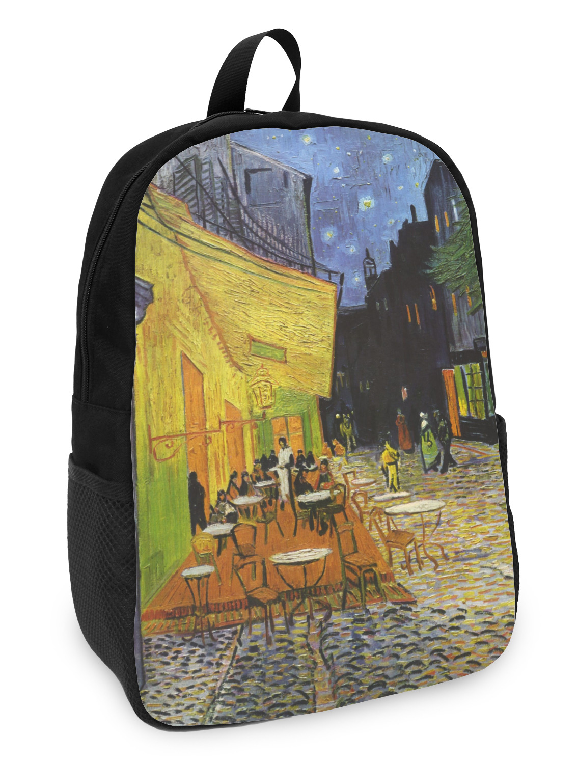 These small backpacks are made of a durable black canvas material with your personalization right on the front. The two shoulder straps are padded and easily adjustable. The bag itself measures at about 11" W x 15" H x 5" D. It's the perfect size for elementary aged kids or adults who want a smaller backpack. On the top of the bag you will find a handle to hang or carry your backpack by as well as a large zipper closure to keep all of your belongings safe inside. On each side of your backpack is a mesh pocket for a small item or water bottle. Inside your backpack you will find a spacious area with a small zipper pocket and a padded laptop slot that will fit up to a 13" laptop (13" being very snug). This is the perfect bag for any student that needs a couple books and their laptop with them at all times. It also works great as a carry on for traveling!