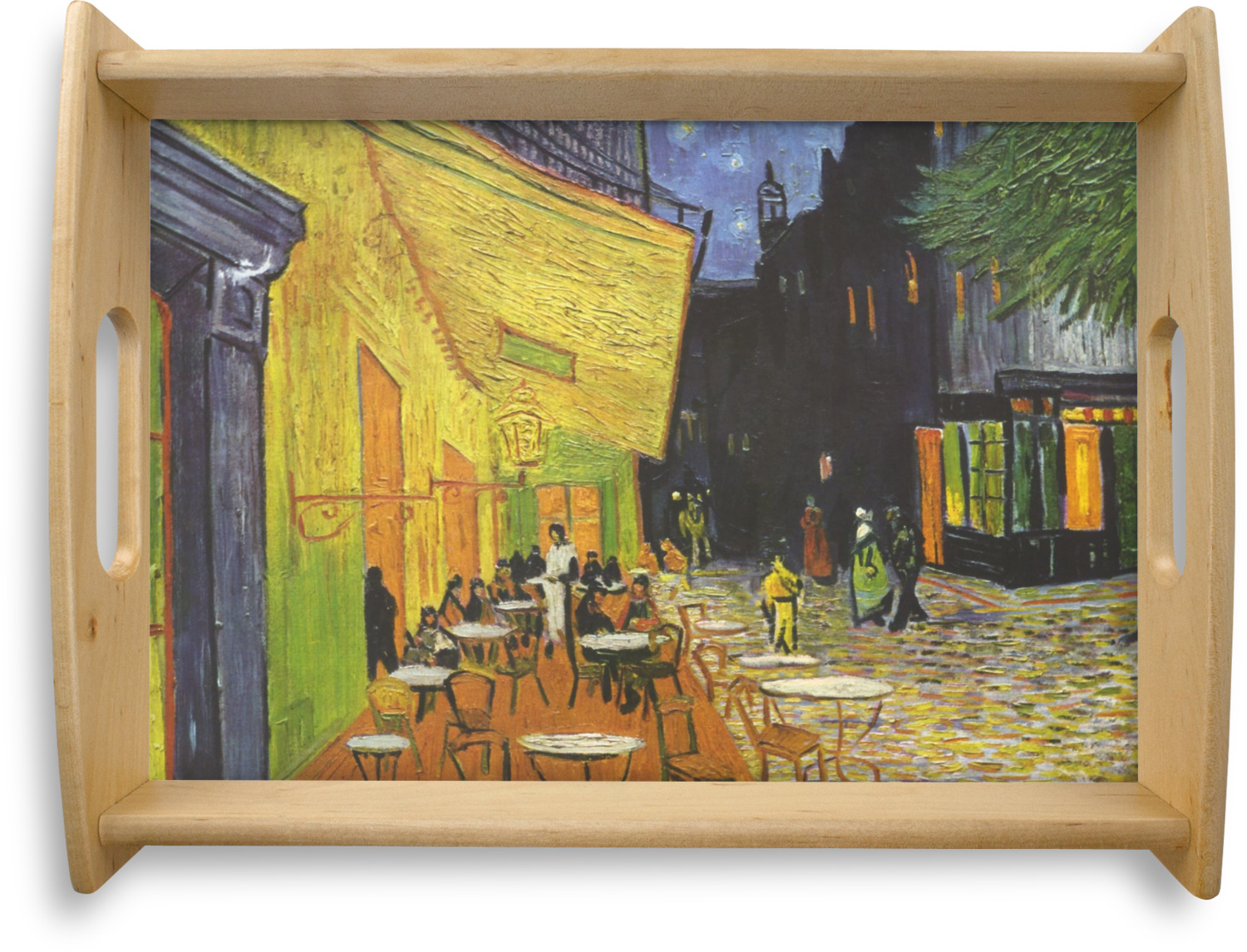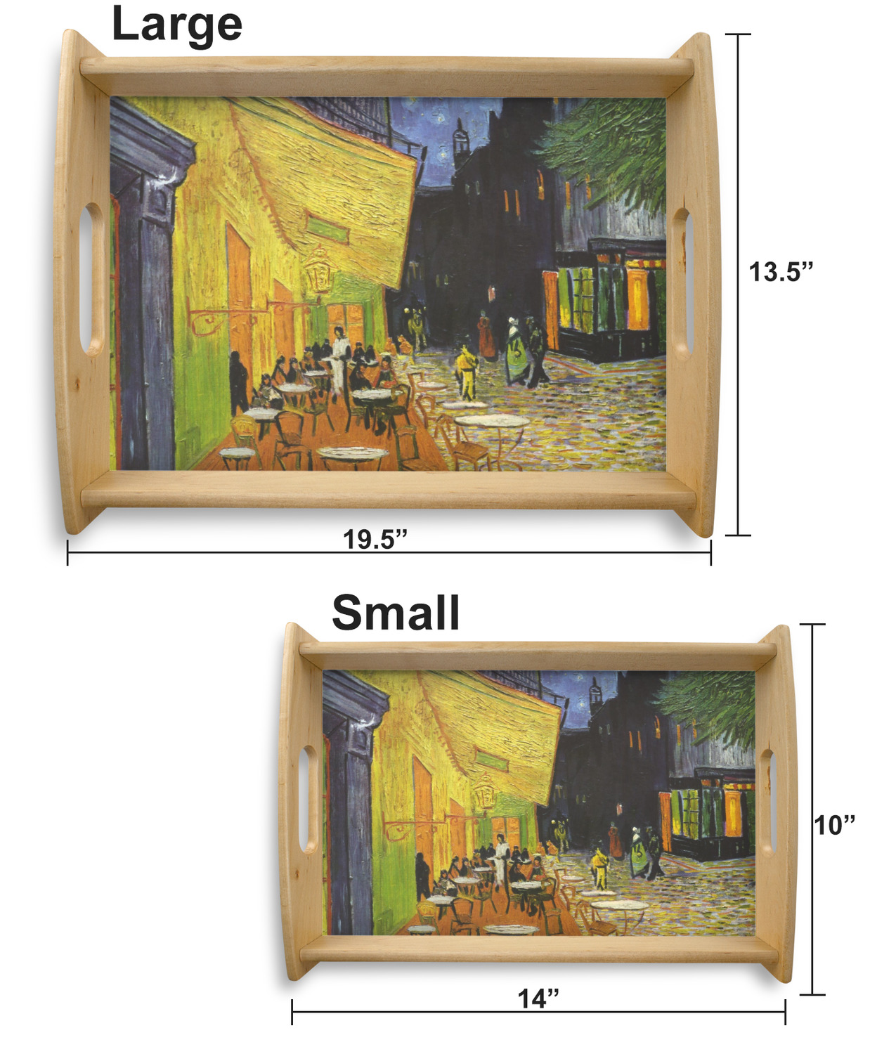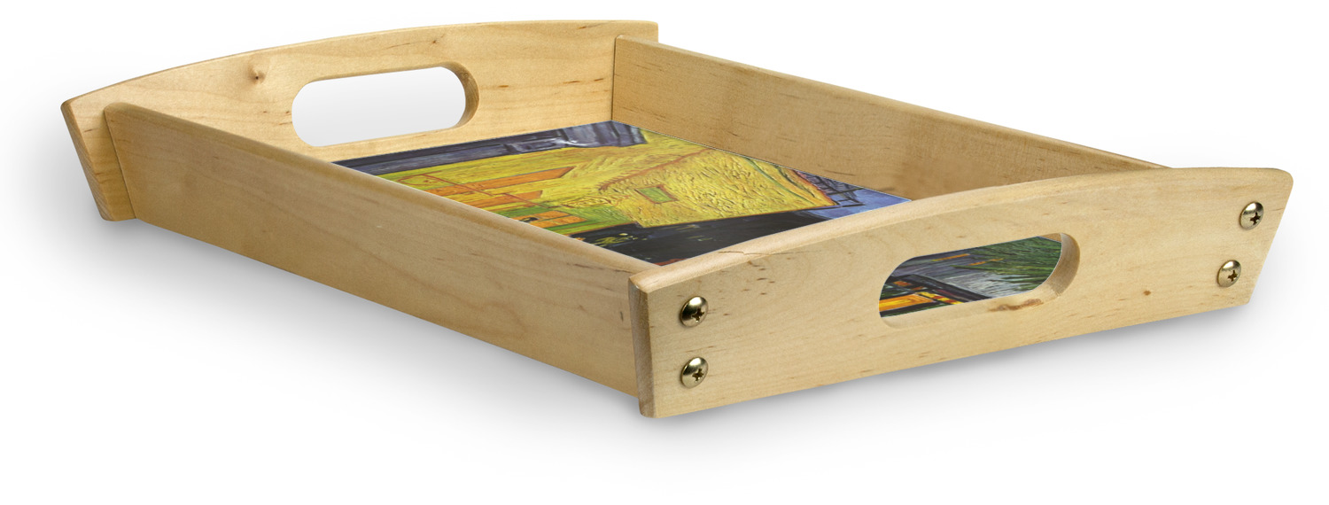 This serving tray with handles features square edges and two rounded sides, creating a very modern look. Each side is fabricated from a beautifully cut, natural wood. The bottom of the interior of the tray displays your customized design in bright, vibrant color. The tray is sold in both a black color and a natural wood look. Each variation of the wood serving tray has two sizes: Small, which is 14" x 10" x 2.25", and Large, which is 19.5" x 13.5" x 2.75".