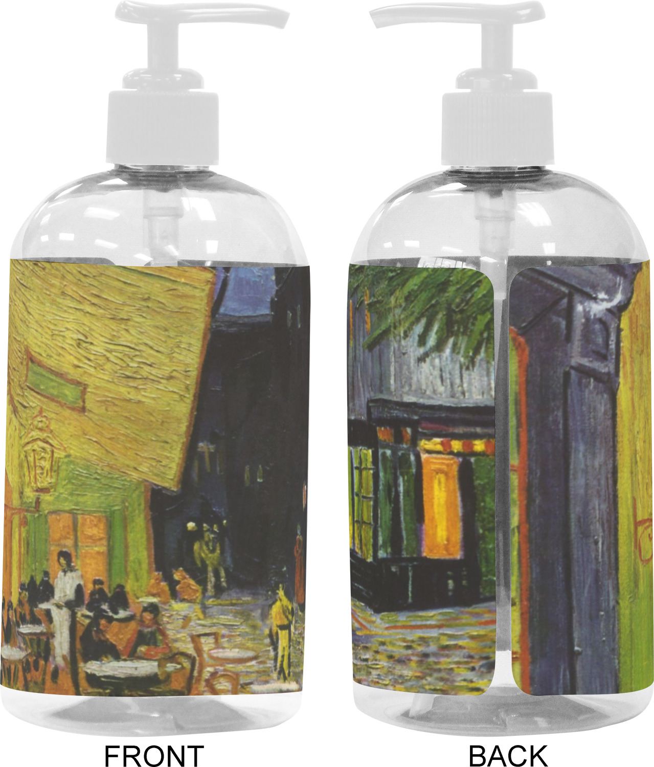 We adhere and wrap your custom printed design around the clear plastic bottle; there is a slight gap at the back for you to see the liquid level. Your design is printed on high gloss vinyl with eco-solvent inks and completely waterproof and will not fade or deteriorate over time. The vinyl is machine cut and adhered by hand to the clear plastic bottle.