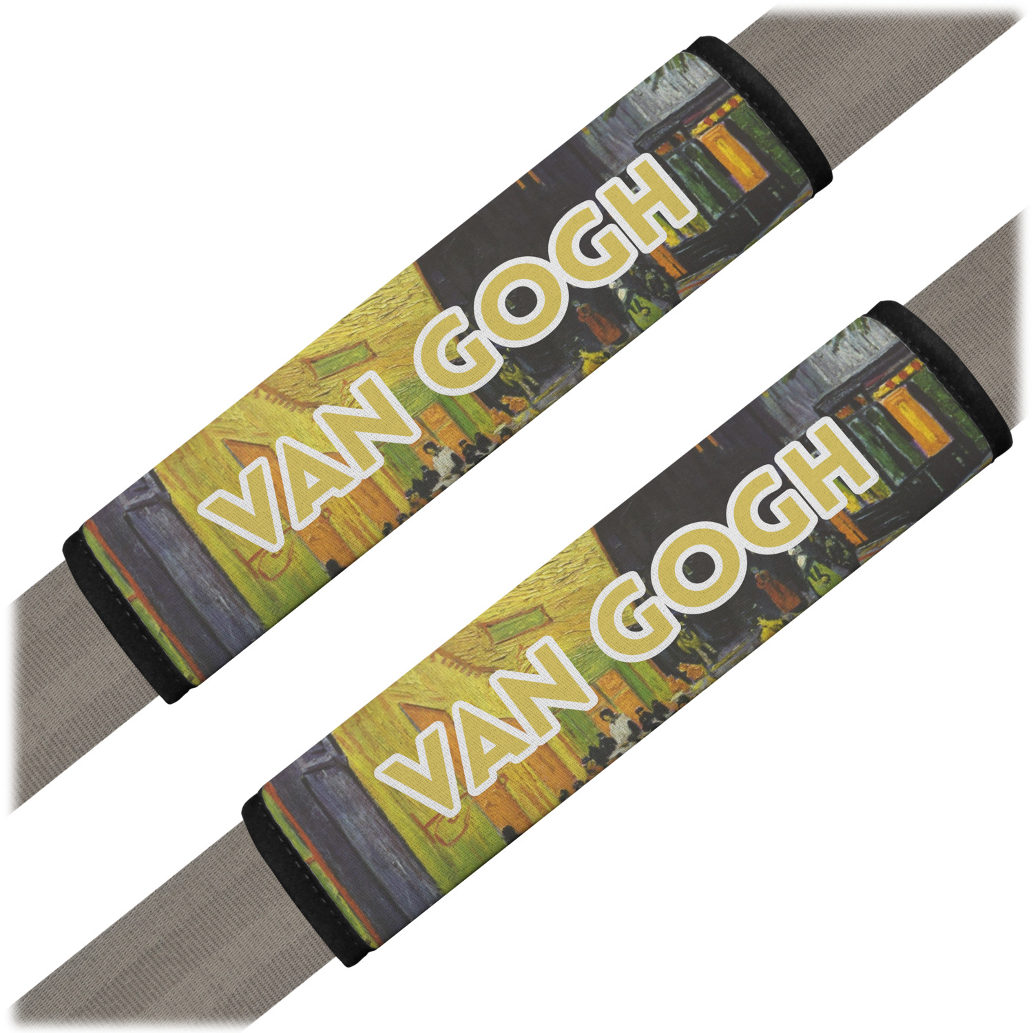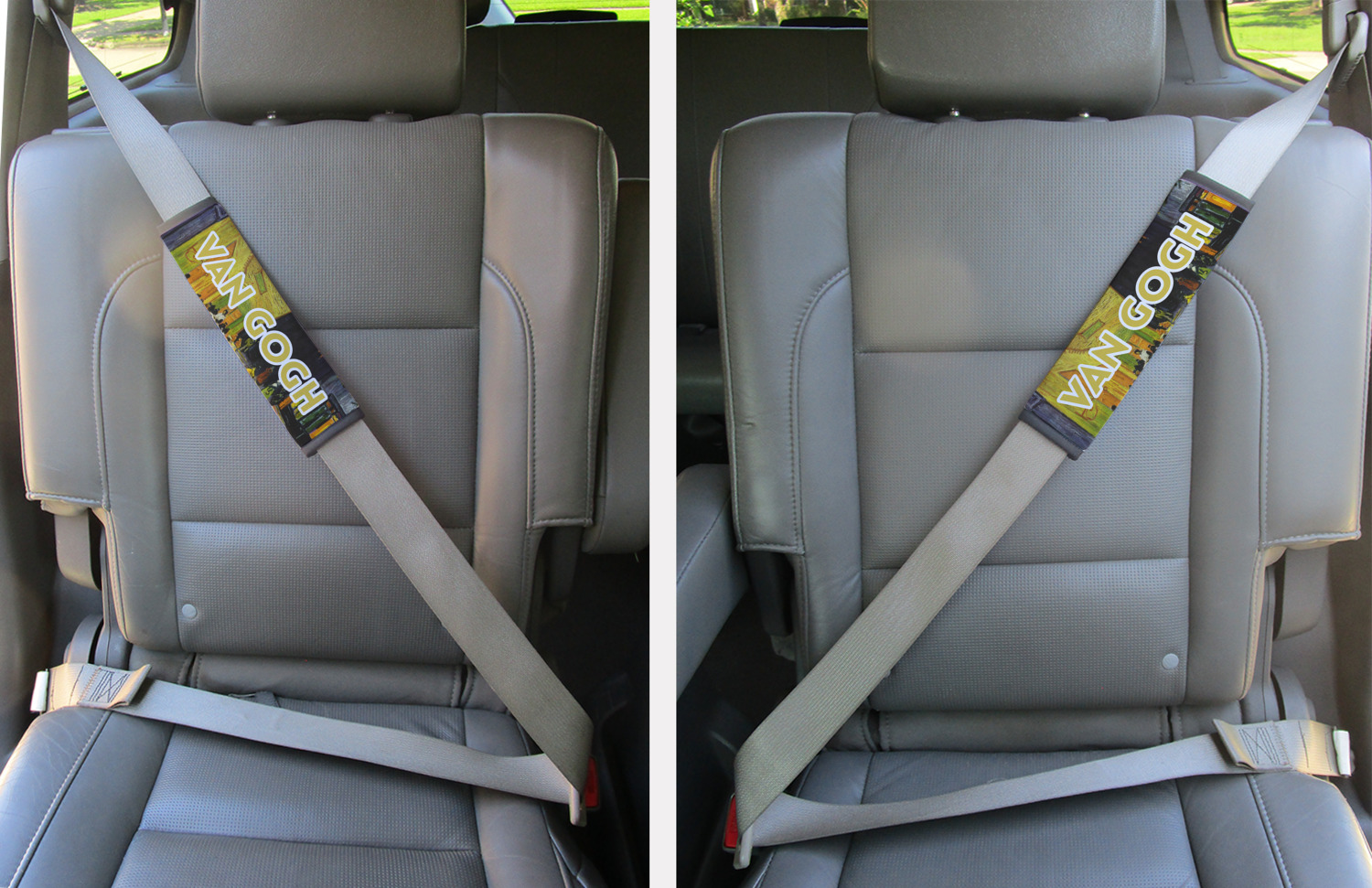 Made from neoprene, our seat belt strap covers wrap around the belt itself and have a Velcro tab for easy attachment and closure. The belt's edges are trimmed with a black polyester for a secure finish. Each cover is 9.5 by 7 inches when open and 9.5 by 2.5 inches when closed. We print your personalized design on the face of the seat belt pad.