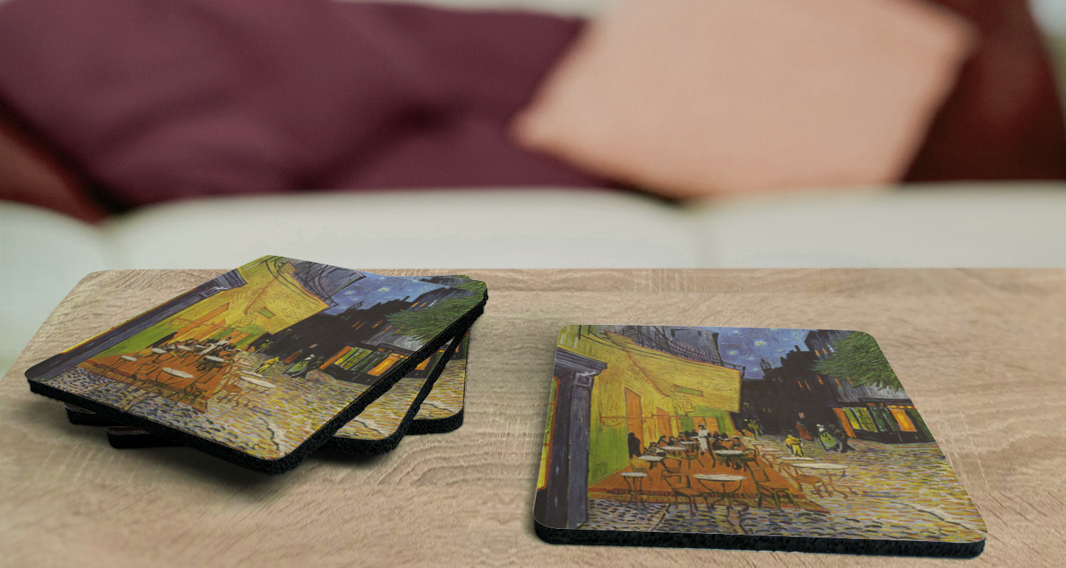 These drink coasters have a smooth, polyester top and a textured, rubber backing on its bottom. The non-slip rubber backing underneath works to keep any spills at bay. At 4 by 4 by 0.25 inches thick, these custom coasters are a suitable size for most drinkware. Your personalization is displayed atop the face of the cup coaster. We sell these rubber coasters in two different shapes: square and round. You can buy each shape as singulars or as a set of 4.