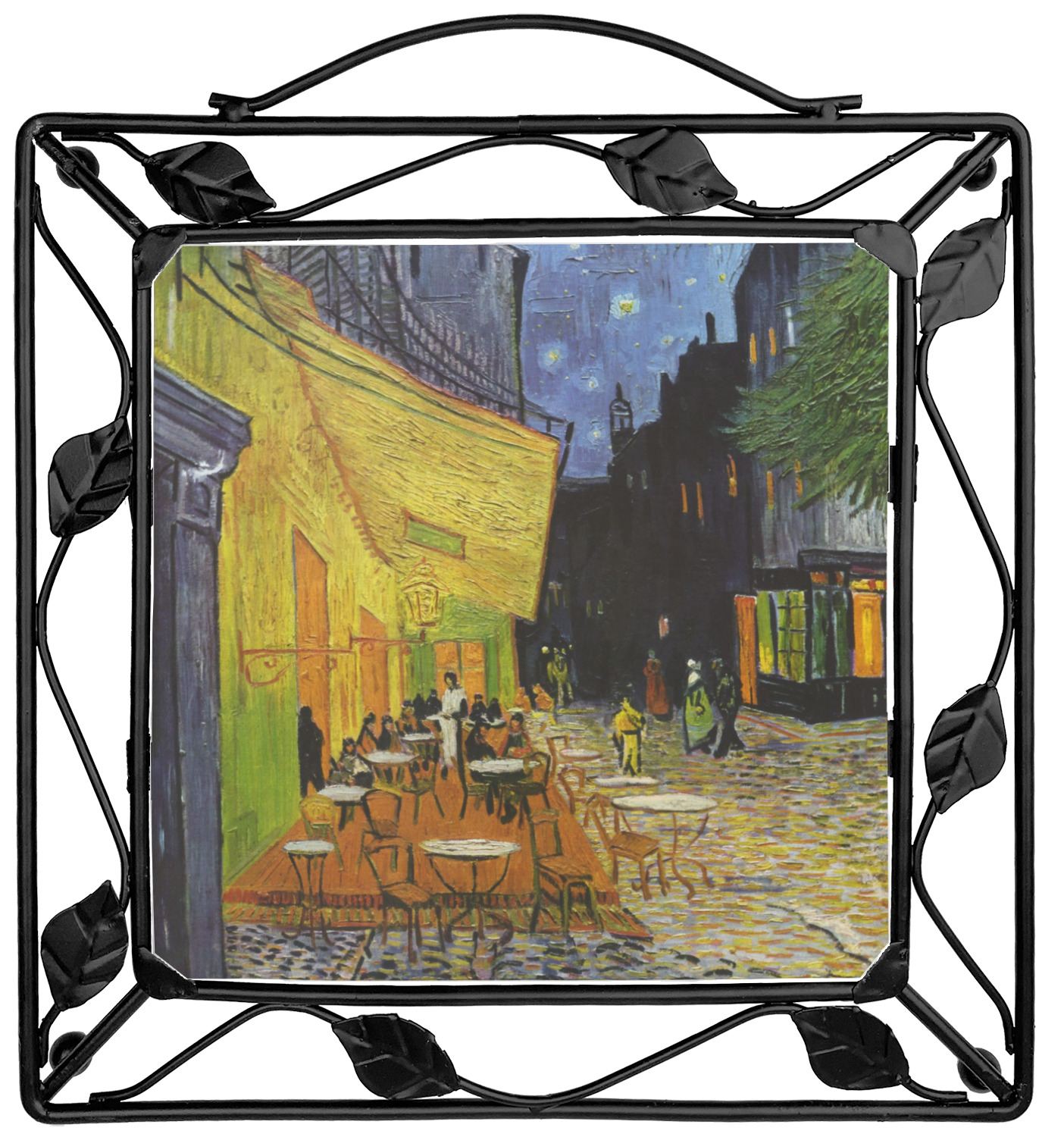 Our square trivets are made from a durable, wrought iron. This model features 4 small half circles, one on each corner, and a larger ring of iron that circles the central, customized tile. Each of the 4 corners has a round foot on its bottom for stability. This trivet is 8.75 by 8.75 inches, but the central tile measures at 6 inches on both sides.
