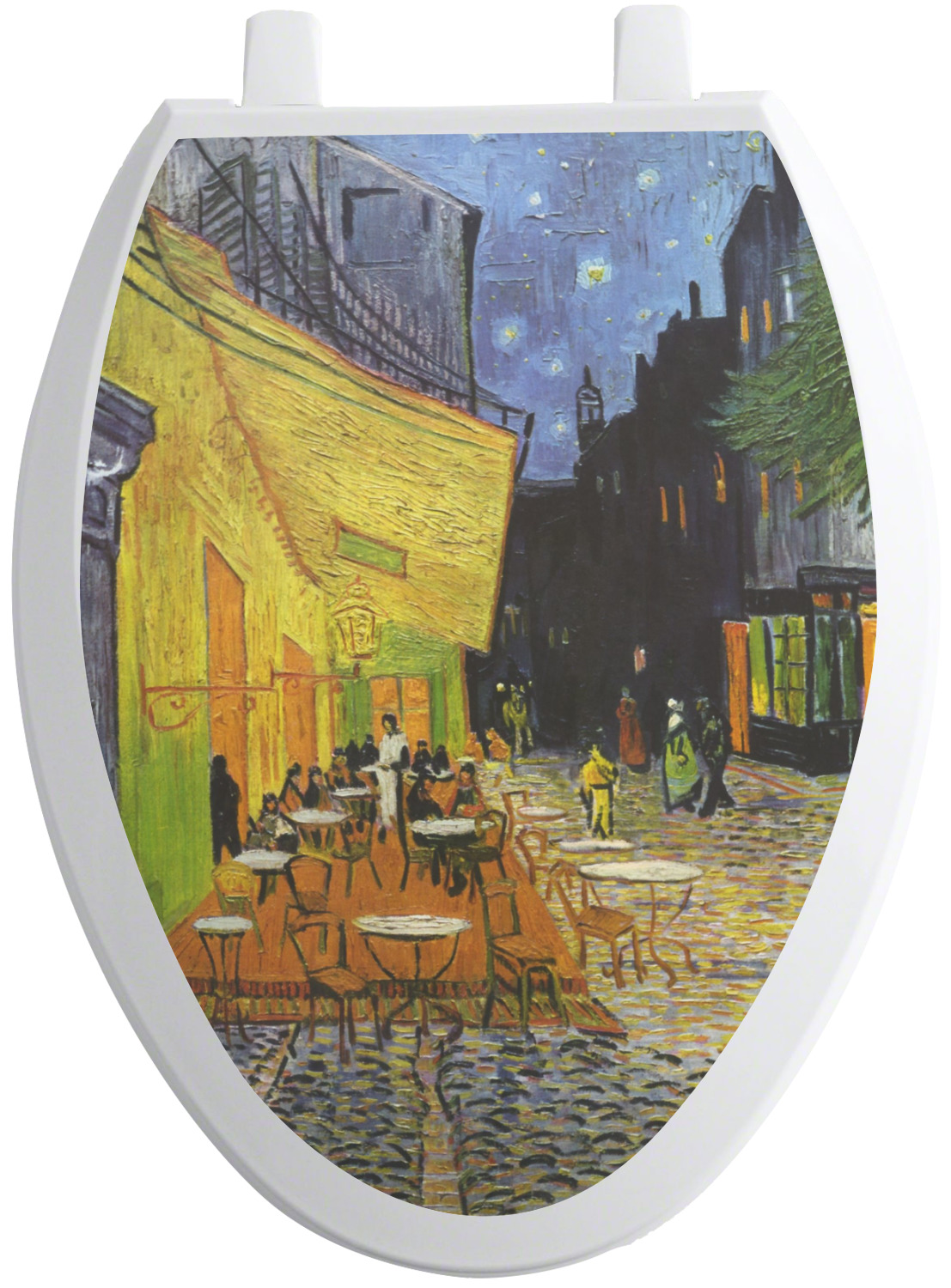 We sell these toilet lid decals in two different shapes to accommodate a wider range of toilet seat shapes. The first shape is our standard, round size, which measures at 13.5 by 12 inches. Our second option is an elongated shape, suited for long toilet seat covers. It measures 15 by 12 inches.
