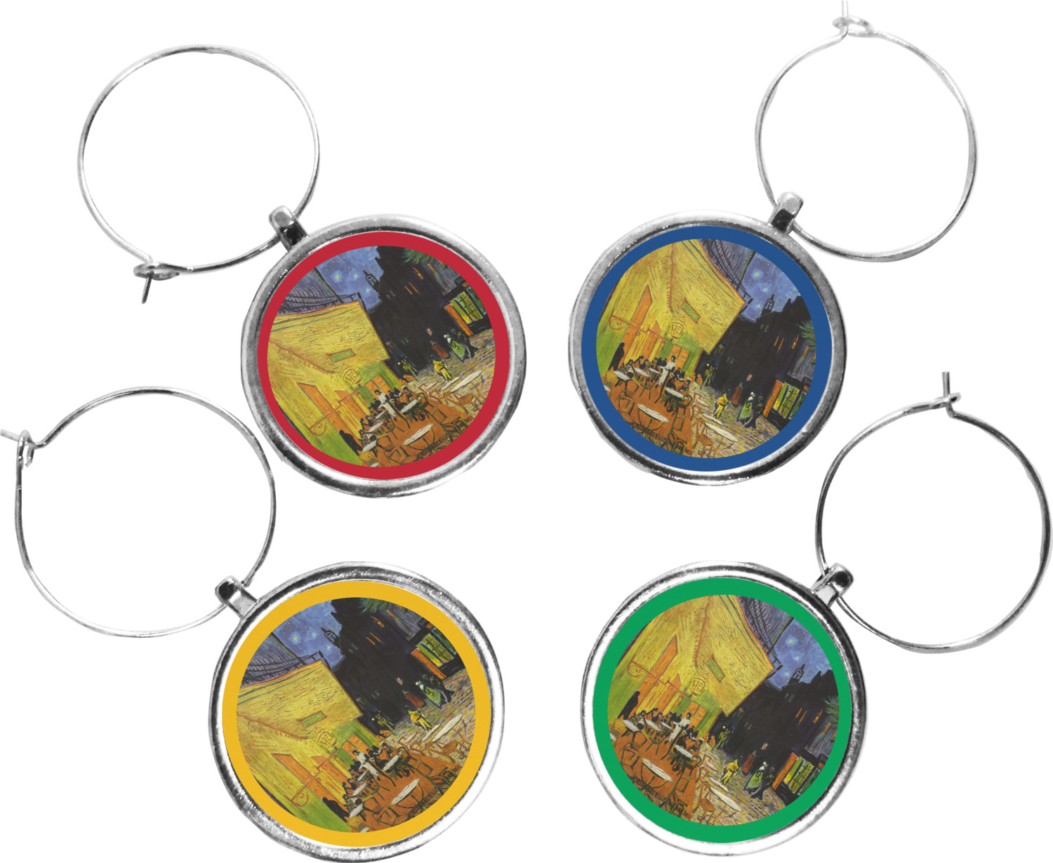 Your wine glass markers are comprised of a circular zinc plate with a 1.25 inch diameter. The zinc plate hangs from a zinc loop, which can be easily secured and removed from the stem of a wine glass. Your customized design is printed onto a 1 inch diameter insert, and then placed into the wine glass charm itself. Though sold in a set of four, you can personalize each charm individually and change the colors of the ring around your design, depending on your needs.