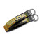 These key fob keychains are made from a polyester weave, right here in the USA. They feature a silver, metal clasp, attached to a round keyring. The piece gives the personalized wristlet a beautiful, finished look. Your customized design is printed on the outside of the keychain strap. We carry these wristlets in two sizes: small, which is 5 inches in width, and large, which is 5.5 inches in width.