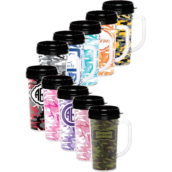 These thermal mugs are free of BPA, and insulated, to keep your drinks hot or cold. The black, snap on lid and the slider for sipping allows you to conveniently sip your drink without constantly worrying about a disastrous spill. We offer this mug with and without a handle, to better suit your needs. Each custom thermal mug holds up to 16 ounces of liquid and displays your customization on all sides on premium gloss media inserts.