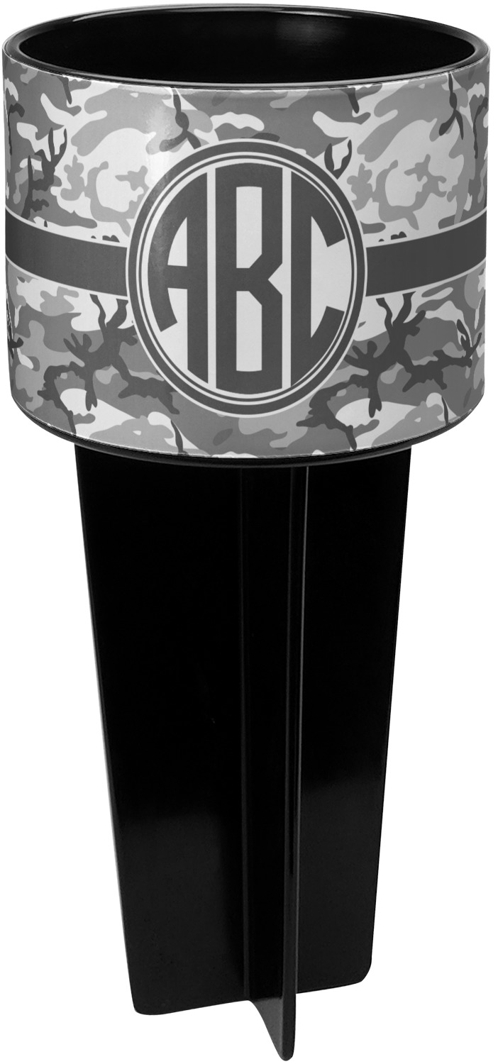 This cup holder has a large stake at its bottom that anchors it to the sand or ground below, while the cup holder rests above the stake. The entire drink holder is made of durable plastic and displays your customization around the cup holder portion. We sell these personalized beach spikers in two different colors: black and white.