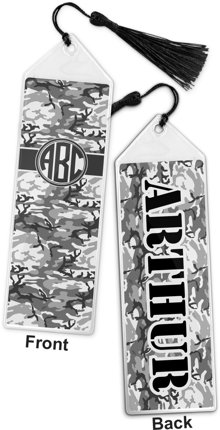 Your personalized bookmark is made of a sturdy, clear vinyl, and is approximately 7.5" x 2.25". We display your personalization on vinyl inserts that are placed on both sides. Accompanying each book marker is a black, fringe tassel that attaches to the reinforced, triangular header.