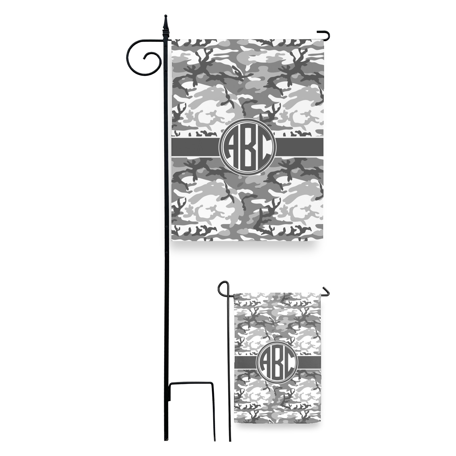 These custom garden flags are made of a durable, double-ply, polyester weave, allowing them to withstand the elements year round. The small flags measure at approximately 12 by 18 inches. The large flags measure out to 28 by 37 inches. You can order these decorative flags with your customization printed on the front only, or the front and back.