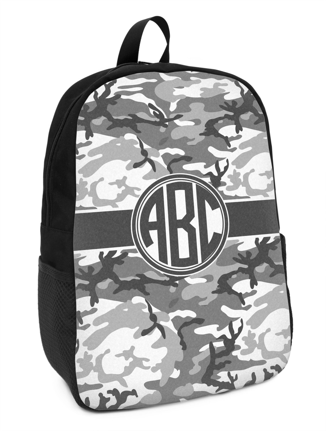 These small backpacks are made of a durable black canvas material with your personalization right on the front. The two shoulder straps are padded and easily adjustable. The bag itself measures at about 11" W x 15" H x 5" D. It's the perfect size for elementary aged kids or adults who want a smaller backpack. On the top of the bag you will find a handle to hang or carry your backpack by as well as a large zipper closure to keep all of your belongings safe inside. On each side of your backpack is a mesh pocket for a small item or water bottle. Inside your backpack you will find a spacious area with a small zipper pocket and a padded laptop slot that will fit up to a 13" laptop (13" being very snug). This is the perfect bag for any student that needs a couple books and their laptop with them at all times. It also works great as a carry on for traveling!