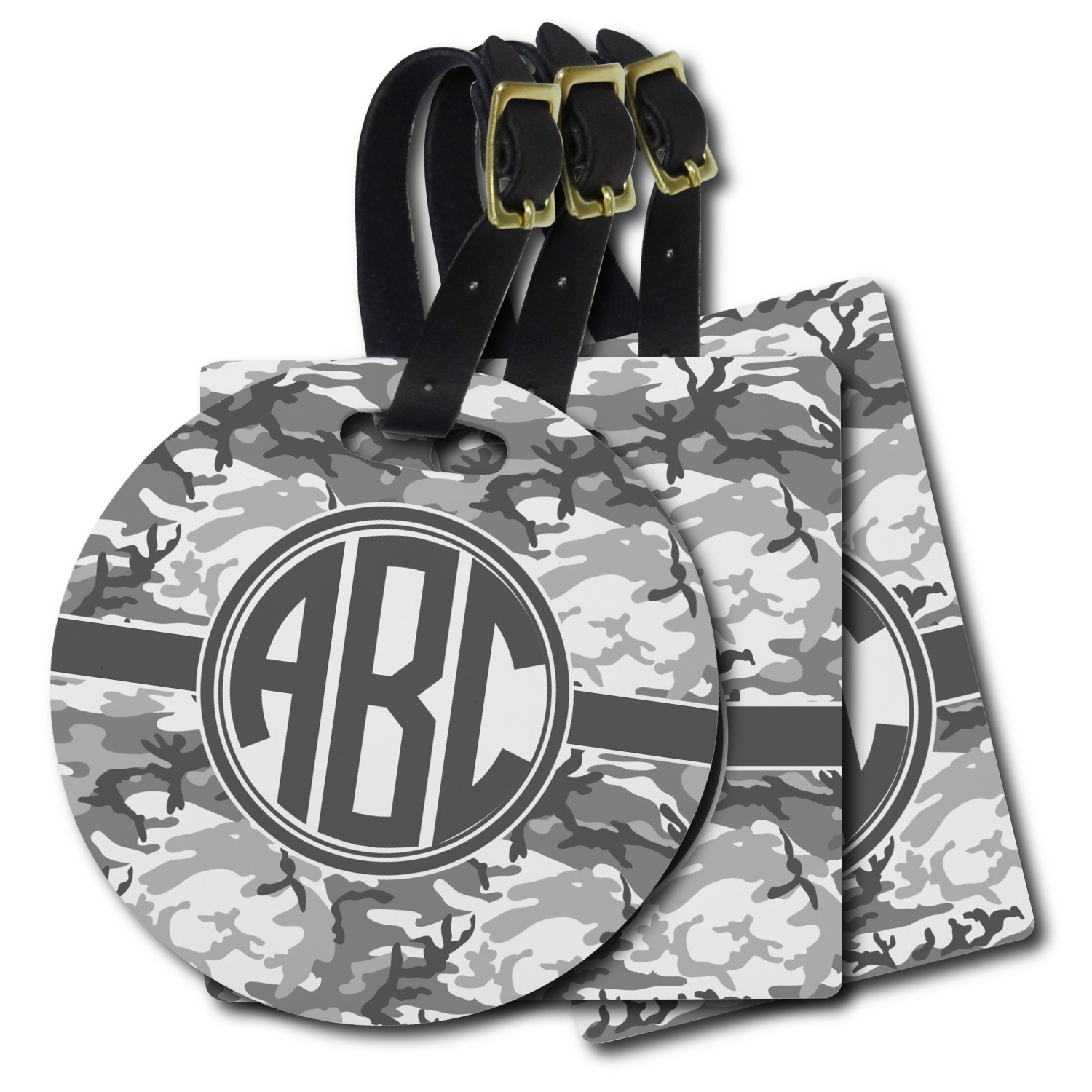 These personalized bag tags are sold in a variety of shapes, so that you may find the product that meets your vision exactly. We sell a round luggage tag, which measures at approximately 4" x 4". Our square luggage tag is about 3.5" x 3.5", while our rectangular version is 2.75" x 4 ".