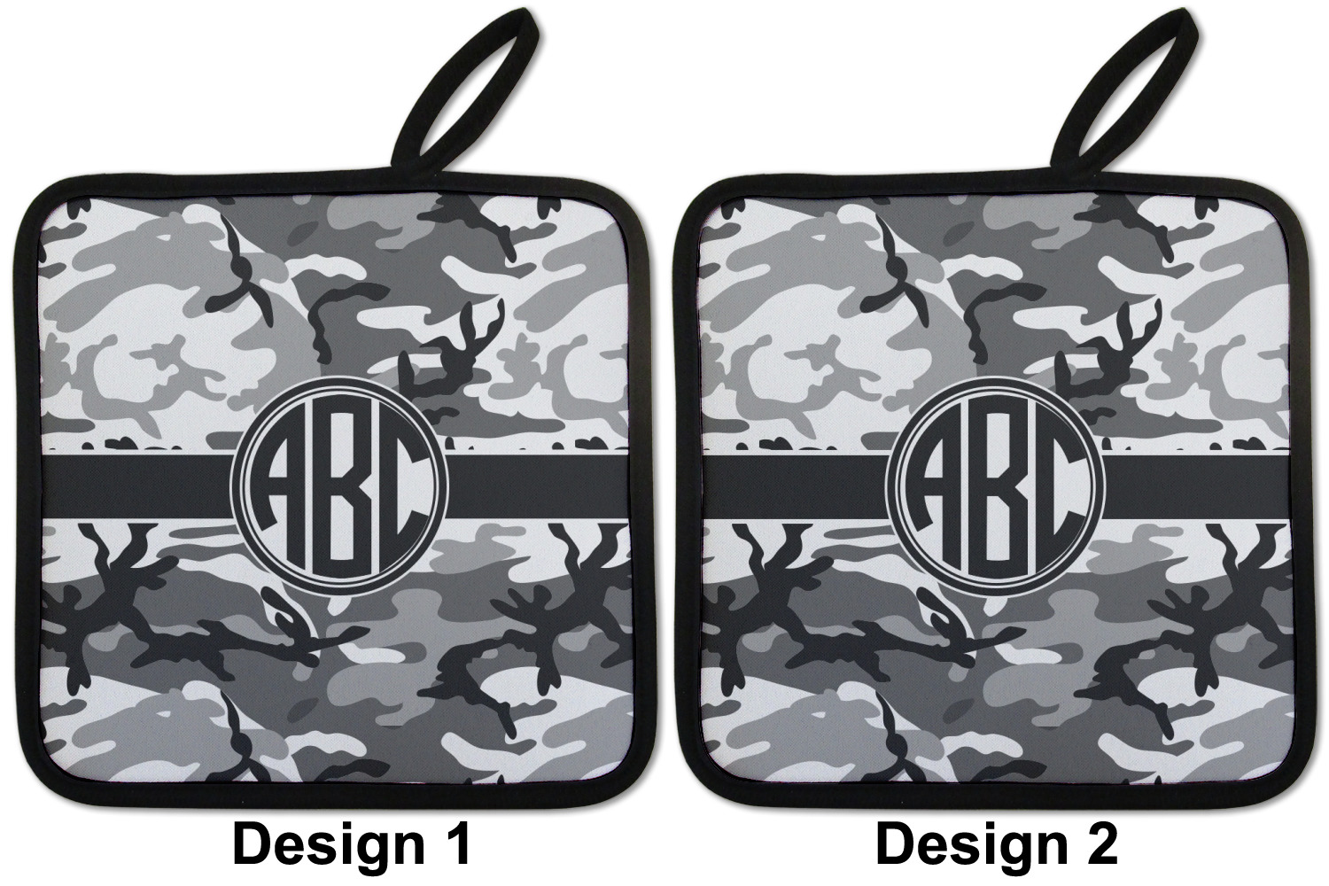 Our personalized pot holders feature a neoprene front that displays your personalization in vibrant colors. The backing of the hot pot holder is rubberized; the textured backing allows you to have a great grip when using this custom pot holder. The two materials are joined with a sleek, black trim, and the holder also includes an attached loop for hanging and storage. The pot holder is approximately 8.75 inches by 8.75 inches and 0.25 inches tall, while the fabric loop is 2.5 inches long. You can purchase a kitchen pot holder by itself or as a set of 2. We also offer a set including one pot holder and one oven mitt.