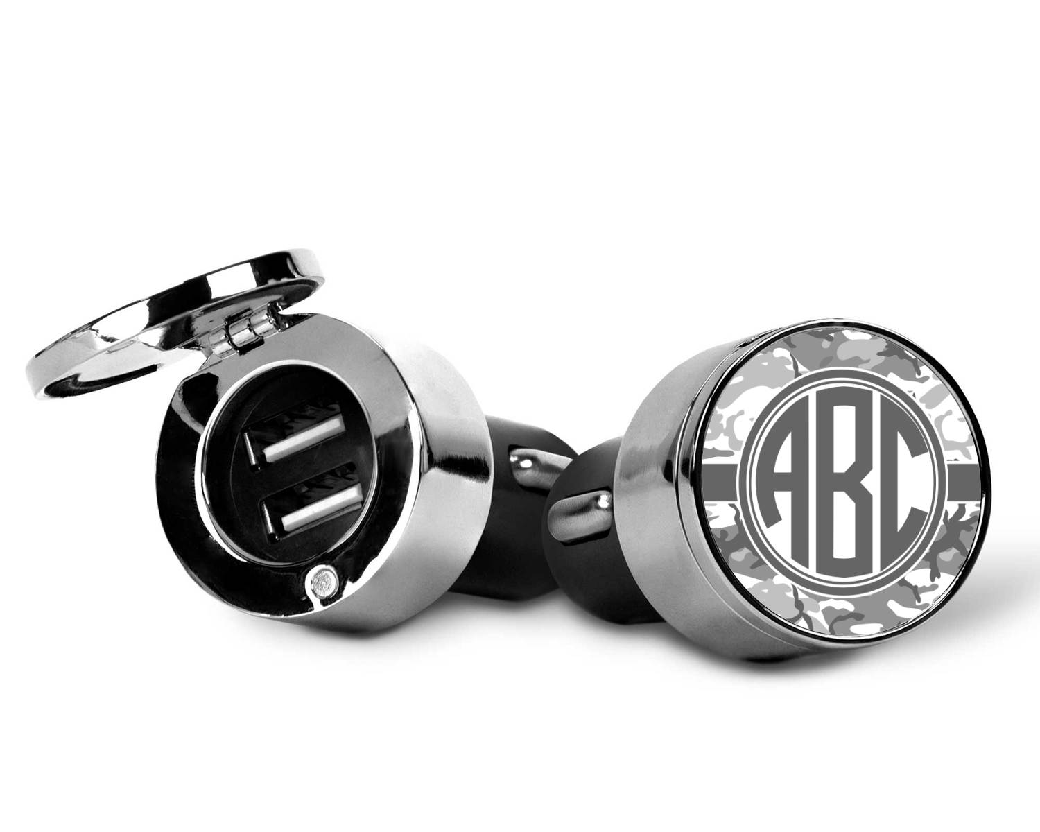 This car charger adapter converts your cars bland cigarette lighter into a decorative, personalized, and operational USB charging port. Made of solid, silver-plated metal, these chargers feature a flip-open lid that both displays your customized design and conceals two USB ports. The metal lid of the USB car charger adapter is 1.5" in diameter and seals due to a small, ingrained magnet on both the charger and its lid. The cigarette lighter insert, itself, is colored black.