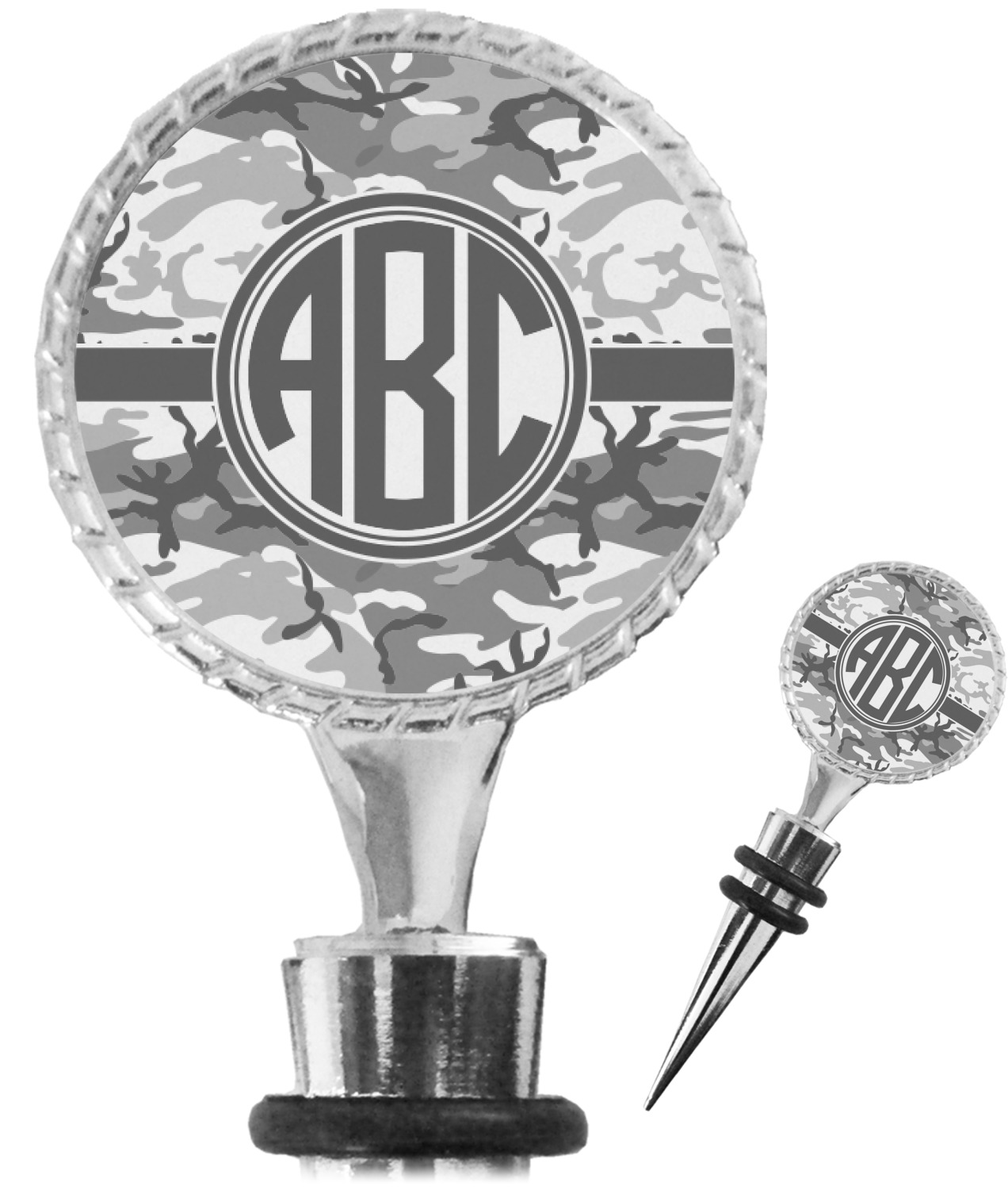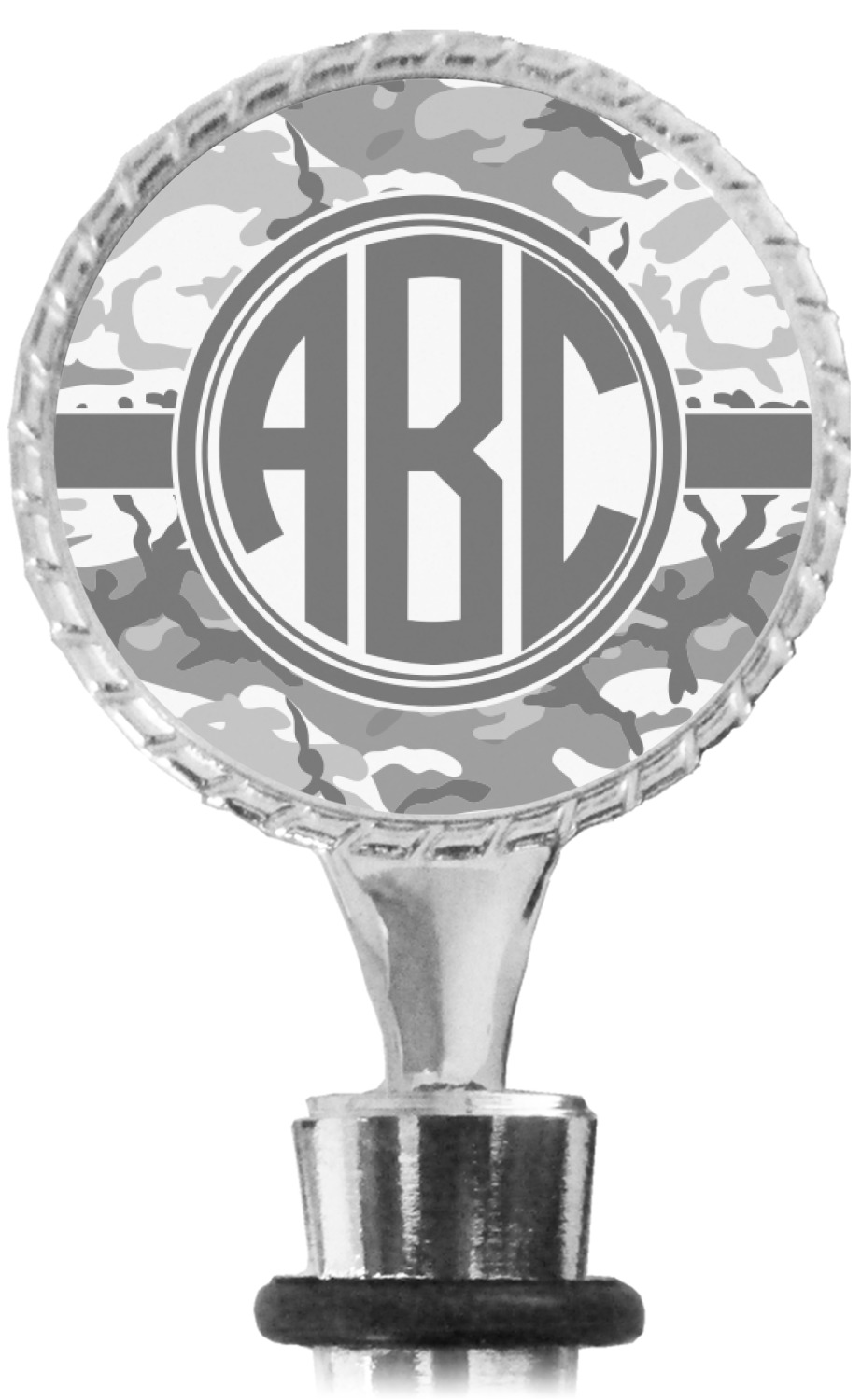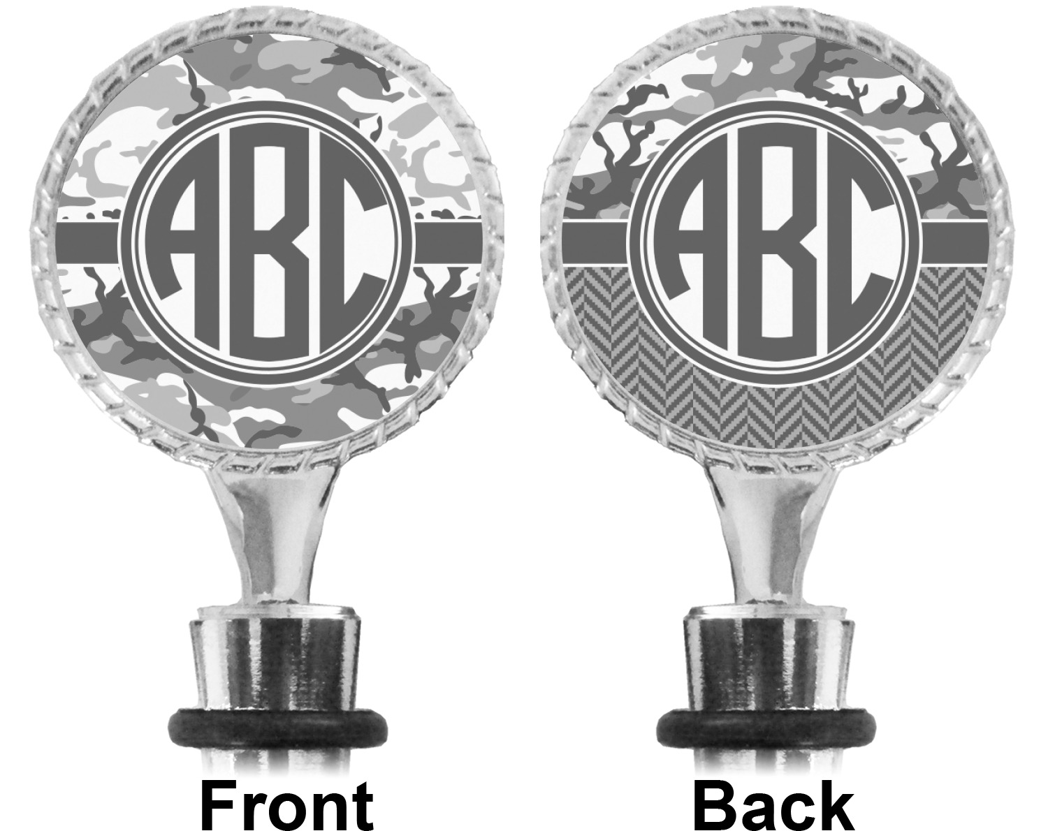 The top part of your bottle stopper is comprised of a zinc ring that displays your customization(s) in its middle, on both sides. The ring is heavy duty, with a bright chrome finish. The body of the wine stoppers have two silicone rings to provide an airtight seal. These wine bottle stoppers measure at 1.625" L x 0.8125" W x 4.625" H; your custom wine stopper is meant to fit into most standard-sized wine bottles.