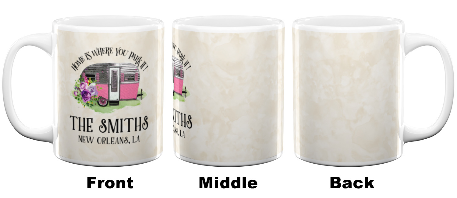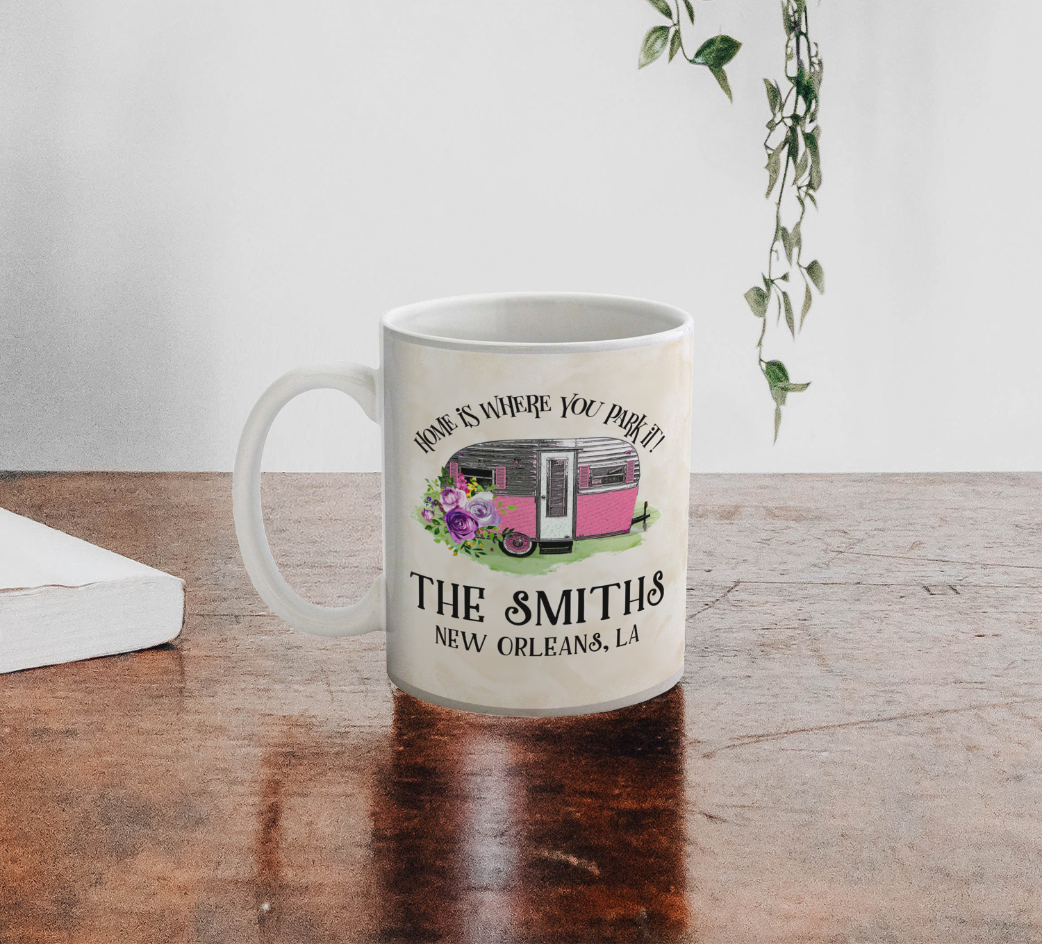 This fun design is absolutely stunning. The background is a subtle tan watercolor texture. The main graphic is an adorable pink trailer camper with sweet flowers all around it. The phrase going above it says "Home is where you park it!" You can easily personalize the text to say the place and date of a specific camping trip you always want to remember.