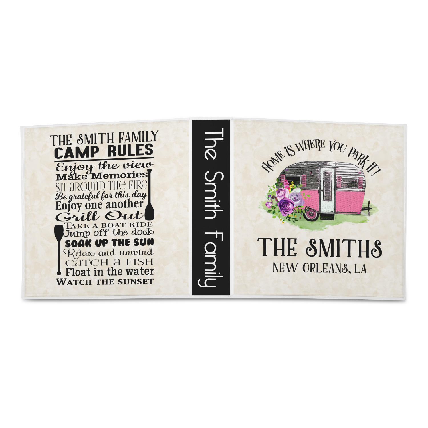 This fun design is absolutely stunning. The background is a subtle tan watercolor texture. The main graphic is an adorable pink trailer camper with sweet flowers all around it. The phrase going above it says "Home is where you park it!" You can easily personalize the text to say the place and date of a specific camping trip you always want to remember.