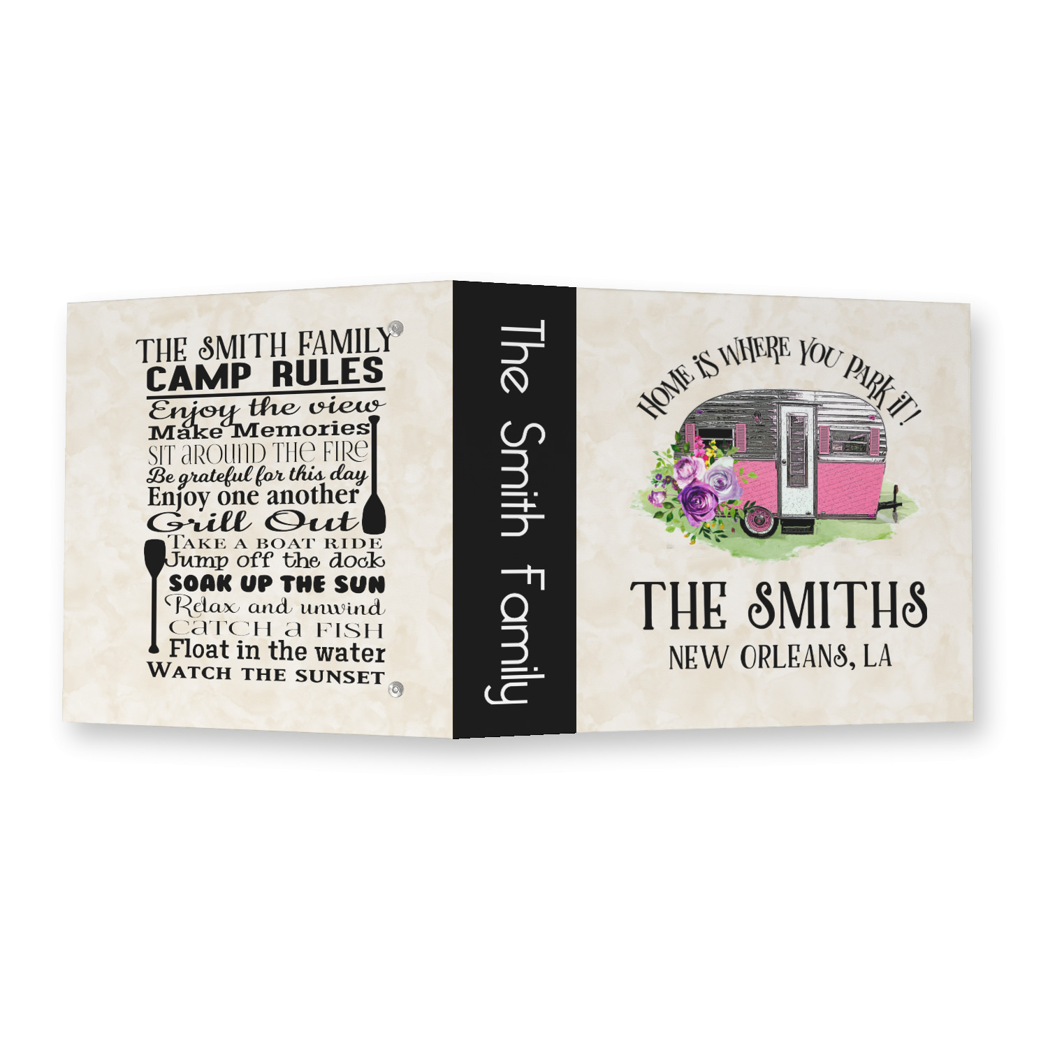 This fun design is absolutely stunning. The background is a subtle tan watercolor texture. The main graphic is an adorable pink trailer camper with sweet flowers all around it. The phrase going above it says "Home is where you park it!" You can easily personalize the text to say the place and date of a specific camping trip you always want to remember.
