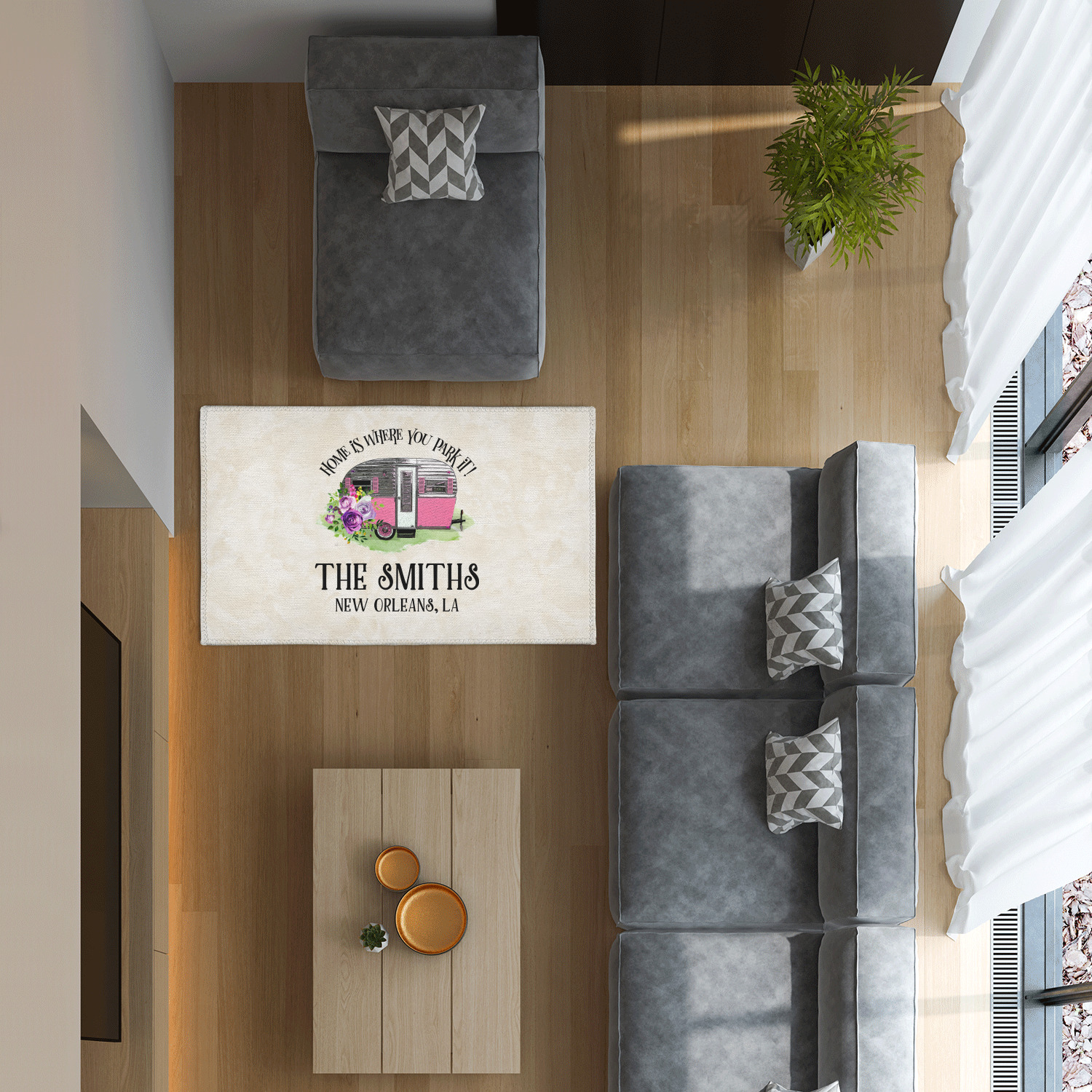 This fun design is absolutely stunning. The background is a subtle tan watercolor texture. The main graphic is an adorable pink trailer camper with sweet flowers all around it. The phrase going above it says "Home is where you park it!" You can easily personalize the text to say the place and date of a specific camping trip you always want to remember.