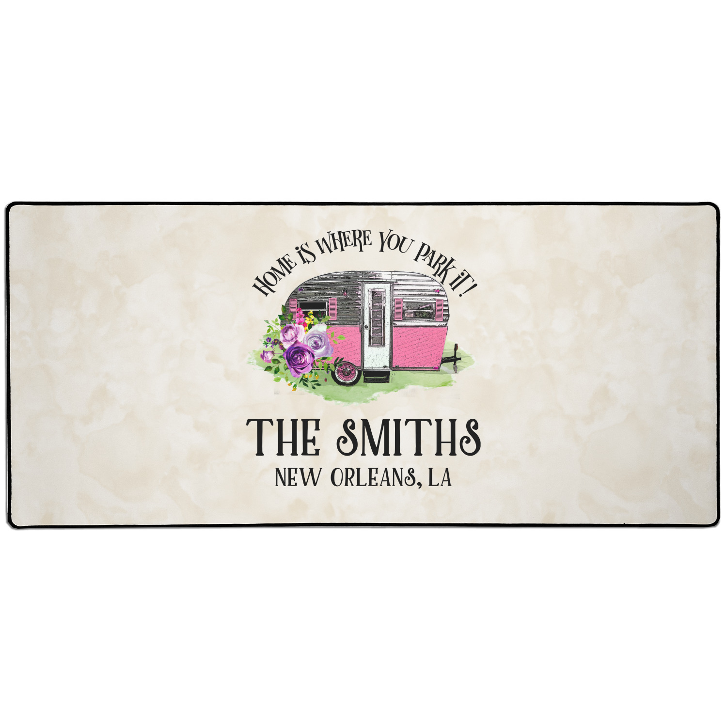 This fun design is absolutely stunning. The background is a subtle tan watercolor texture. The main graphic is an adorable pink trailer camper with sweet flowers all around it. The phrase going above it says "Home is where you park it!" You can easily personalize the text to say the place and date of a specific camping trip you always want to remember.