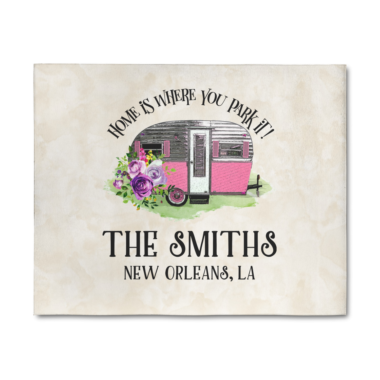 This fun design is absolutely stunning. The background is a subtle tan watercolor texture. The main graphic is an adorable pink trailer camper with sweet flowers all around it. The phrase going above it says "Home is where you park it!" You can easily personalize the text to say the place and date of a specific camping trip you always want to remember.