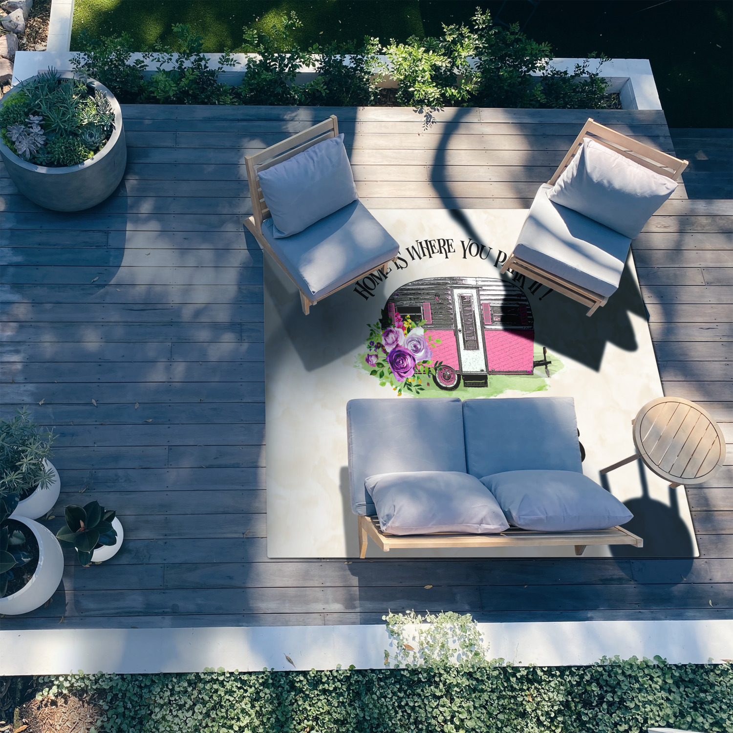 Our custom patio area rugs are velvety soft and smooth, with a short pile, beautiful sewn corners and edges for a refined and exquisite finished look. The poly chenille face is printed with your design and is sure to brighten up any room with its fabulous look. They have just enough cushion to feel comfortable under foot but not soak up water in the weather and offer a quick drying material.