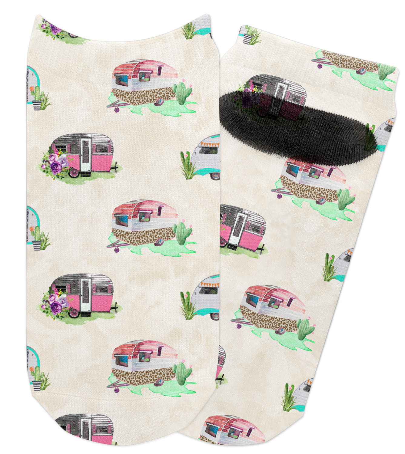 This fun design is absolutely stunning. The background is a subtle tan watercolor texture. The main graphic is an adorable pink trailer camper with sweet flowers all around it. The phrase going above it says "Home is where you park it!" You can easily personalize the text to say the place and date of a specific camping trip you always want to remember.