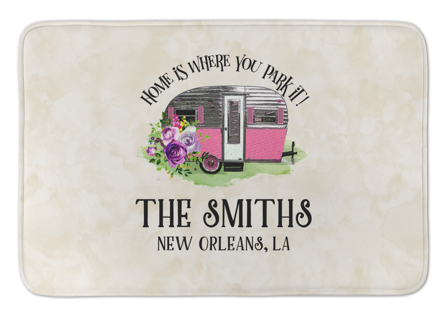 This fun design is absolutely stunning. The background is a subtle tan watercolor texture. The main graphic is an adorable pink trailer camper with sweet flowers all around it. The phrase going above it says "Home is where you park it!" You can easily personalize the text to say the place and date of a specific camping trip you always want to remember.