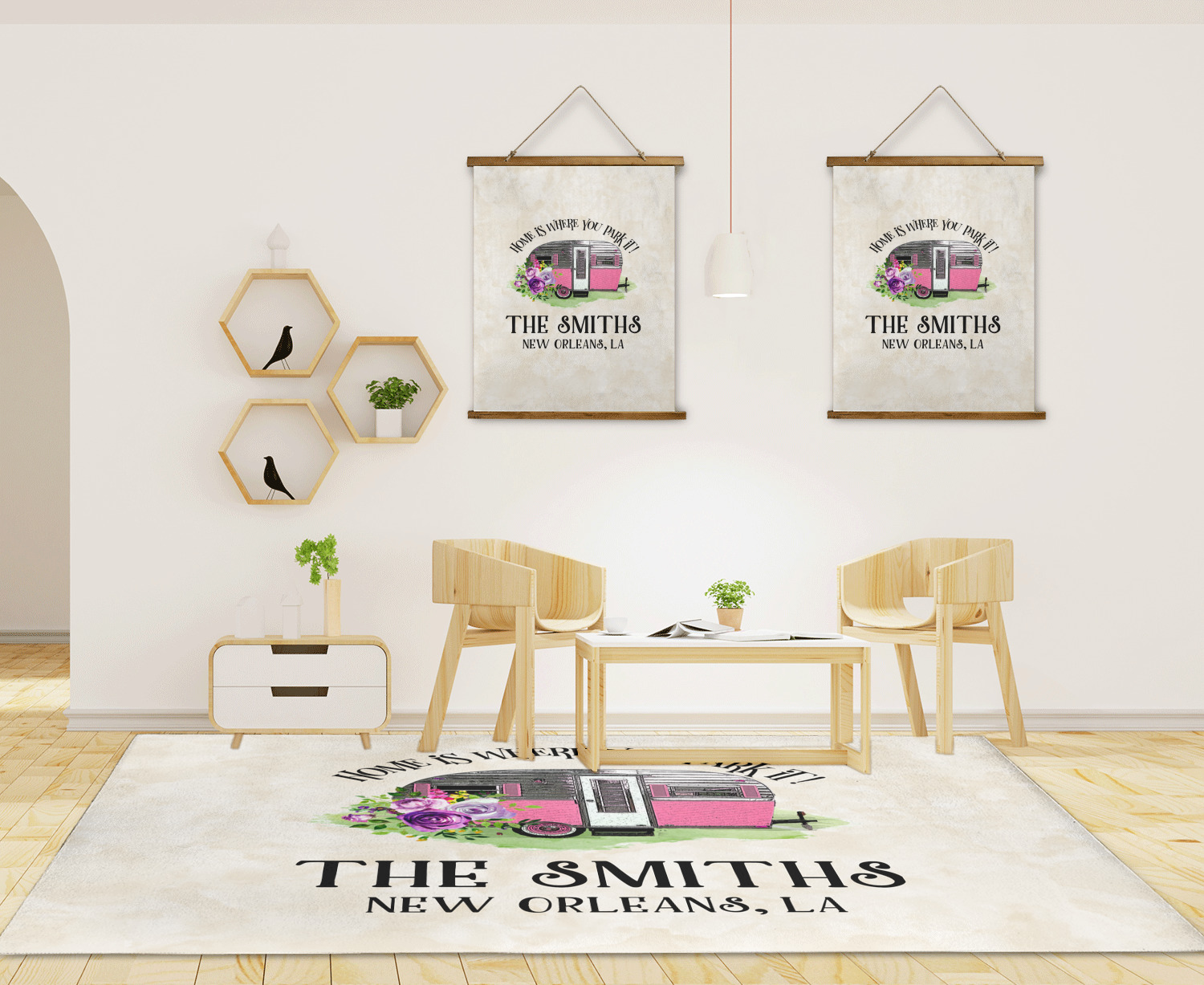 This fun design is absolutely stunning. The background is a subtle tan watercolor texture. The main graphic is an adorable pink trailer camper with sweet flowers all around it. The phrase going above it says "Home is where you park it!" You can easily personalize the text to say the place and date of a specific camping trip you always want to remember.