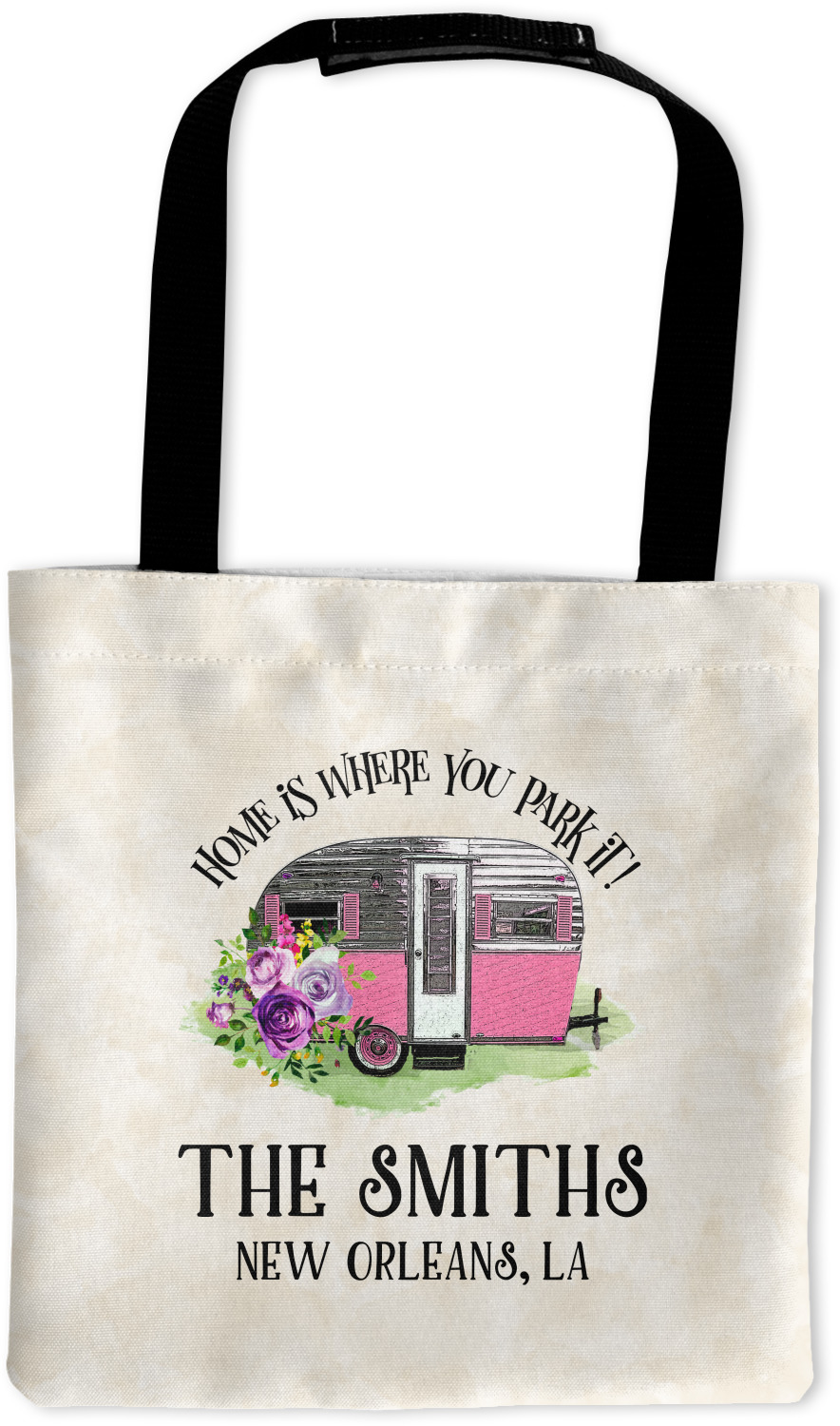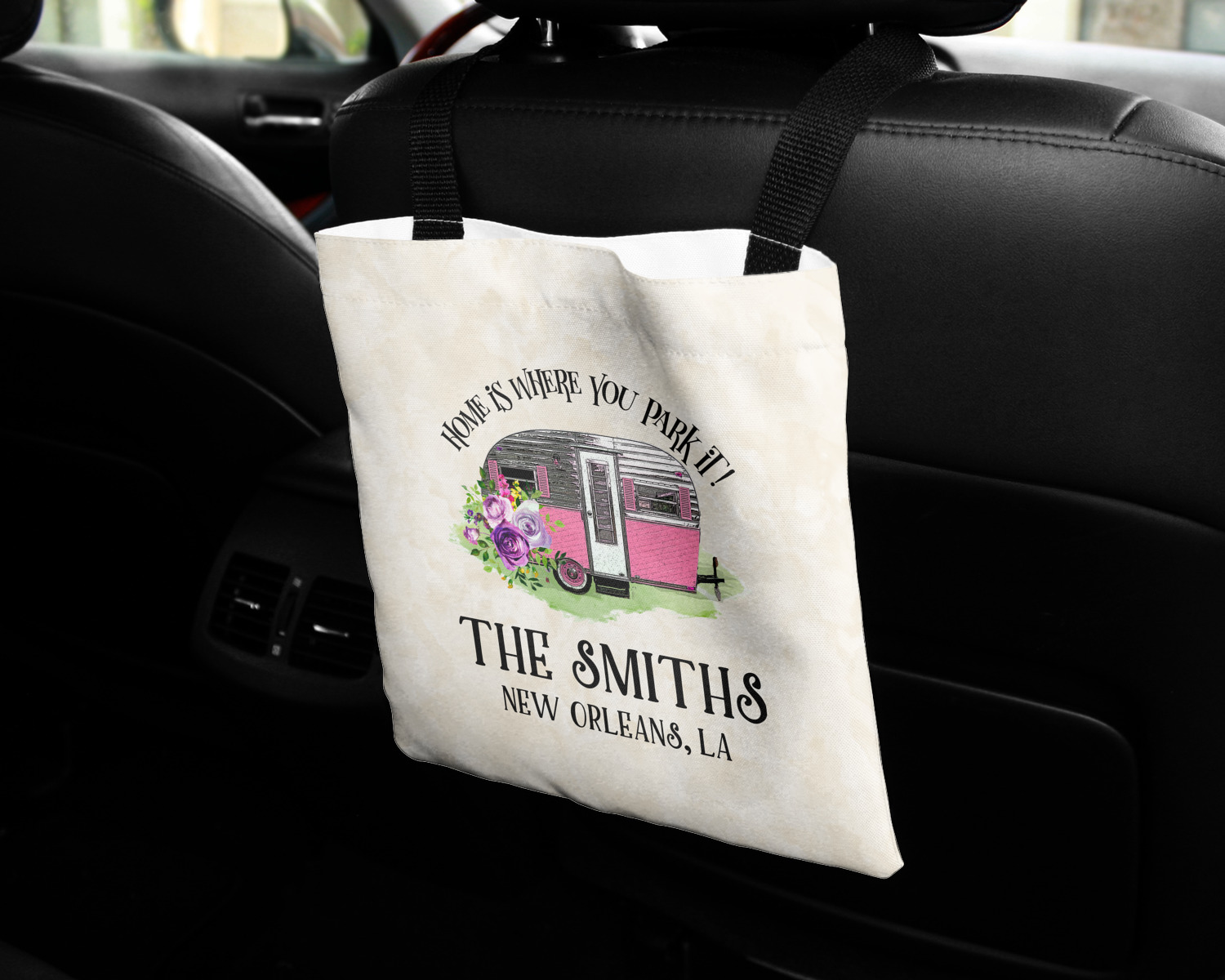 This fun design is absolutely stunning. The background is a subtle tan watercolor texture. The main graphic is an adorable pink trailer camper with sweet flowers all around it. The phrase going above it says "Home is where you park it!" You can easily personalize the text to say the place and date of a specific camping trip you always want to remember.