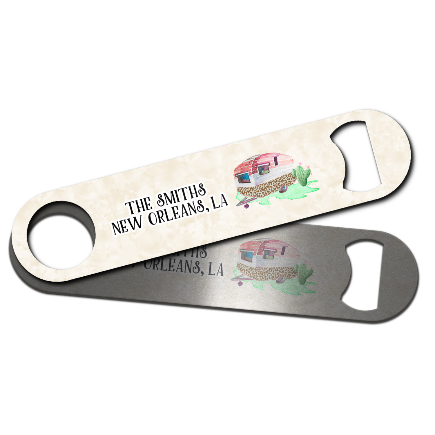 Stop struggling with the caps or your bottled beverages by purchasing one of our personalized bottle openers! These wrench-like custom bar blades are built to last. Customize one for your home's bar, or as a practical gift for a loved one!