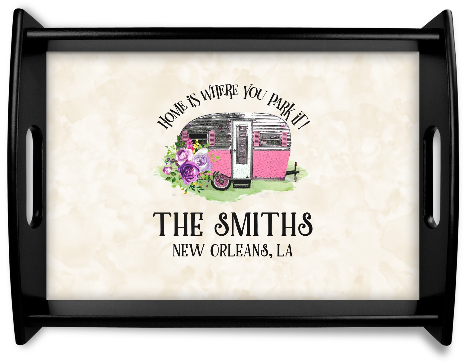 This fun design is absolutely stunning. The background is a subtle tan watercolor texture. The main graphic is an adorable pink trailer camper with sweet flowers all around it. The phrase going above it says "Home is where you park it!" You can easily personalize the text to say the place and date of a specific camping trip you always want to remember.