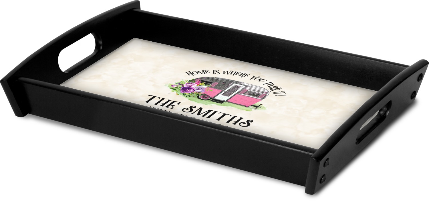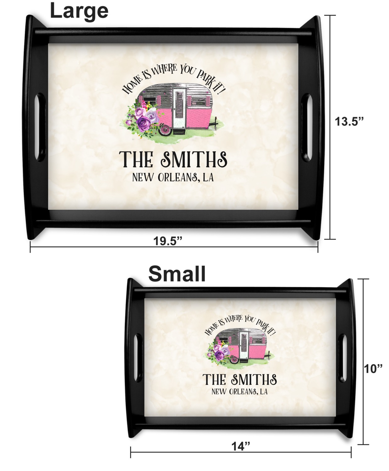 This serving tray with handles features square edges and two rounded sides, creating a very modern look. Each side is fabricated from a beautifully cut, natural wood. The bottom of the interior of the tray displays your customized design in bright, vibrant color. The tray is sold in both a black color and a natural wood look. Each variation of the wood serving tray has two sizes: Small, which is 14" x 10" x 2.25", and Large, which is 19.5" x 13.5" x 2.75".
